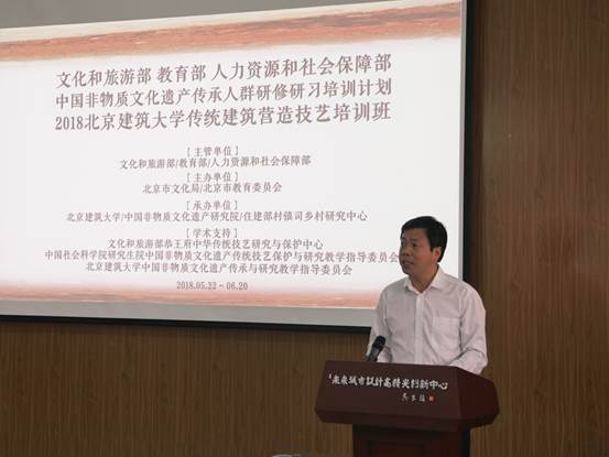 为深入学习贯彻习近平总书记强调要加强文化遗产保护传承,推动中华优秀传统文化创造性转化、创新性发展的精神。贯彻落实《关于实施中华优秀传统文化传承发展工程的意见》、《国家“十三五”文化发展改革规划纲要》要求,2018年5月23日上午,由文化和旅游部、教育部、人力资源和社会保障部主办,mkmksport承办的“中国非物质文化遗产传承人群研修研习培训计划”第三期传统建筑营造技艺培训班在公司西城校区未来城市设计高精尖创新中心一层报告厅举办开班仪式。