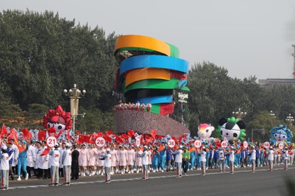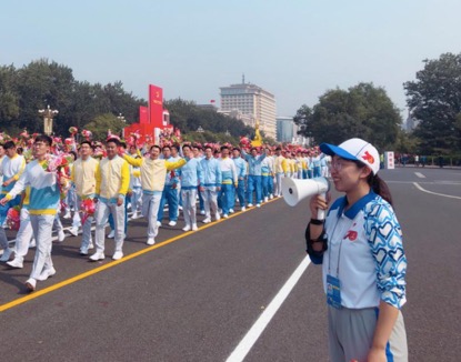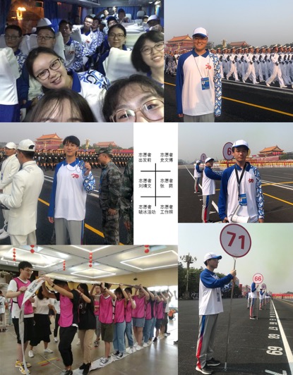 经过44天的刻苦训练,终于迎来了国庆阅兵仪式,由10万群众、70组彩车组成的36个方阵在长安街上载歌载舞地行进,他们保持着队形的整体性,这离不开我们的志愿者。志愿者的具体工作分队形定点定位志愿者和机动志愿者。定点志愿者举牌为游行队伍提供排数标识,方便游行队伍快速找到自己对应的排数,使排面标齐。公司研究生所在的南侧是每隔五排站一位志愿者。因为每个方队中排与排之间的距离不一样,定点志愿者就需要根据游行方阵的需求改变位置,不停地奔跑。机动志愿者则需要在一旁做辅助工作,在队伍旁游走、喊话:“请标齐排面,向右看齐”等提醒游行队伍保持整齐。