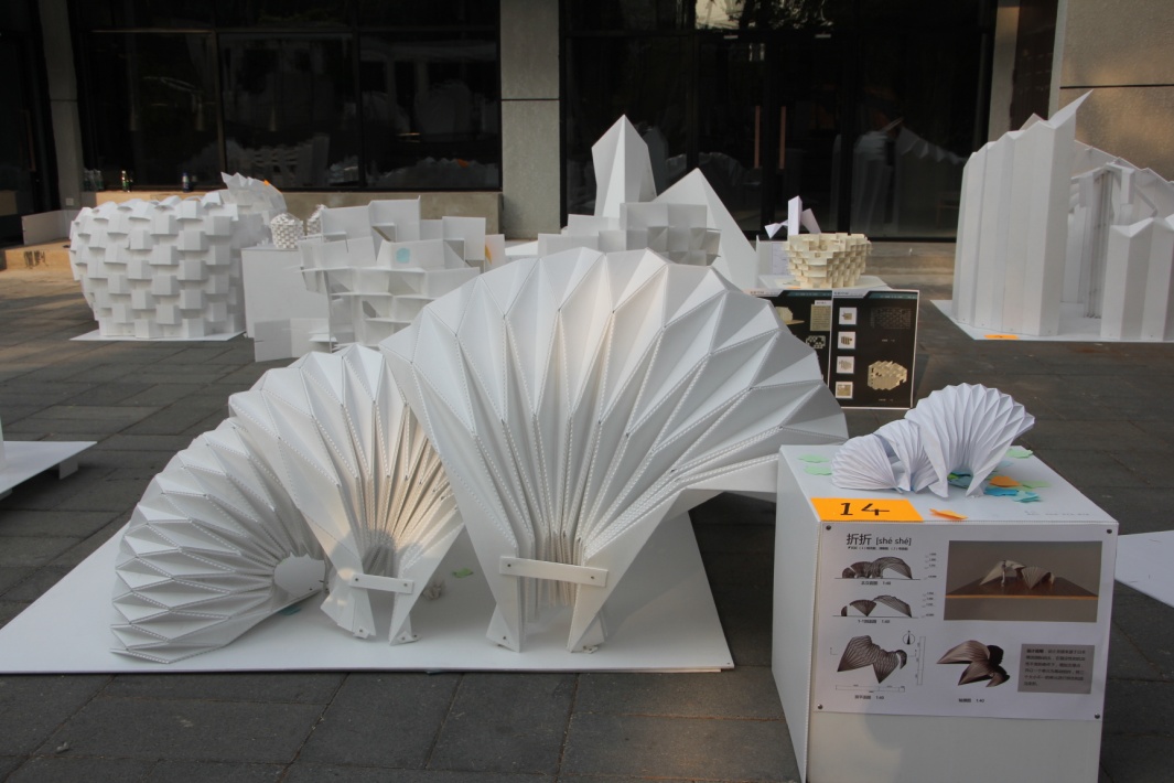 “折折”是本届建造节的一等奖,设计灵感来源于日本横滨国际码头,造型独特的模型吸引了众多人的眼光。不同于别的小组拼接方式,该设计最大的亮点在于结合材料特性,是唯一运用整板折叠而成的设计。查阅资料,小组成员计划在稳定性和抗压性不变的条件下,增加支撑点,并以一个单元为基础组件,将三个大小不一的单元进行拼合和适当的变形,在下沉广场,“折折”成了一道独特的风景线。