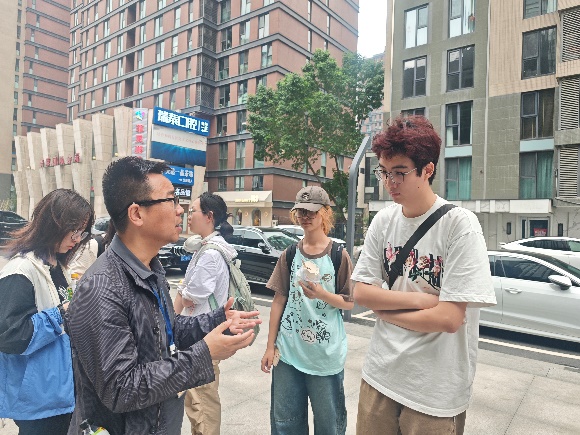 在实践过程中,同学们在刘剑锋老师的带领下,对东湖街道多个具有代表性节点进行深入调研。刘老师首先向大家介绍了街道的基本情况,系统梳理东湖街道的发展脉络与空间肌理,使同学们对其有了总体认识。调研过程中,同学们实地观察各类功能区及节点的实际情况,刘老师结合现场实景进行为大家详细讲解节点的设计理念、实际作用和功能意义。活动最后,同学们交流感悟,提出疑问,刘老师一一耐心解答。