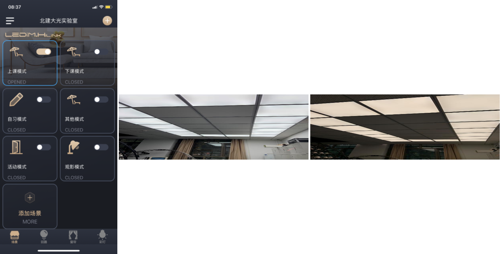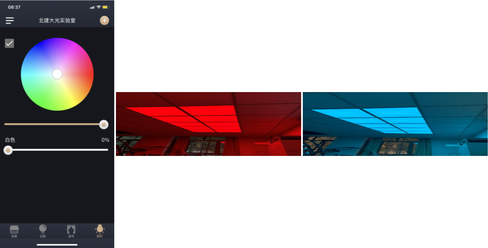 本套LED动态天花照明系统,将用于公司光环境实验教学中,实现“色温与节律”、“光色与物色的色度学比对”、“典型照明场景模拟与设计”等一系列实验环节。