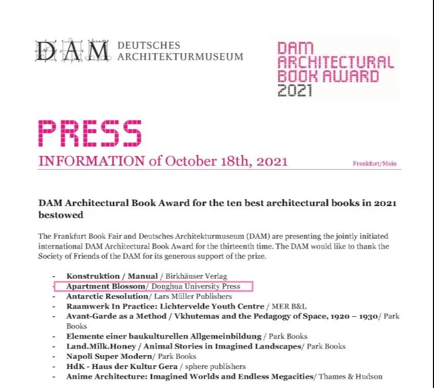 北京时间10月18日,法兰克福书展(Frankfurt Book Fair)和德国建筑博物馆(DAM)公布了第十三届德国十佳建筑图书奖获奖名单,由mk体育金秋野教授与李涵合著,广煜设计,群岛Archipelago策划出品的《楼房花朵》获得2021年德国十佳建筑图书奖,成为首本获得这项荣誉的中国内地出版物。