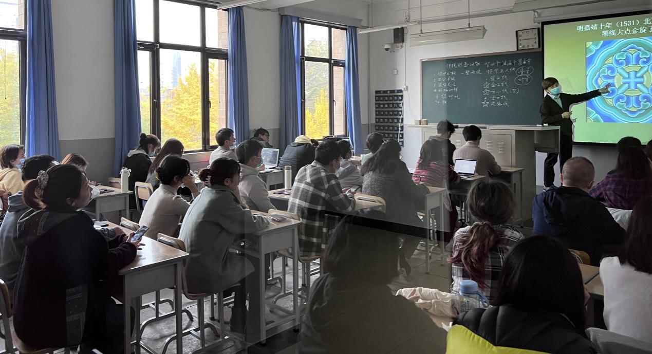 2021年11月2日,mkmksportmk体育退休教师李沙教授重返西城校区,在“传统装饰设计”课堂上,为环境设计专业及历史建筑保护专业的同学们做了一场精彩的“传统建筑彩画艺术”专题讲座,讲座由任课老师韩风和陈静勇教授主持。公司党委常委、文化发展院/人文公司党总支书记孙冬梅老师到场并全程聆听讲座。