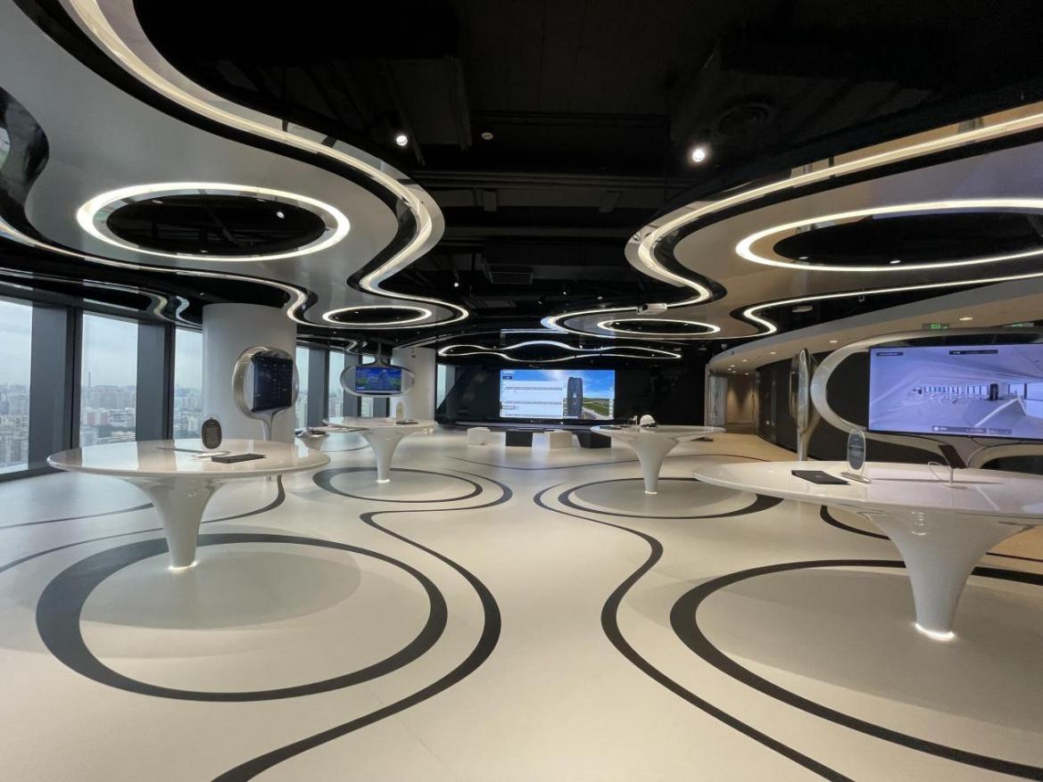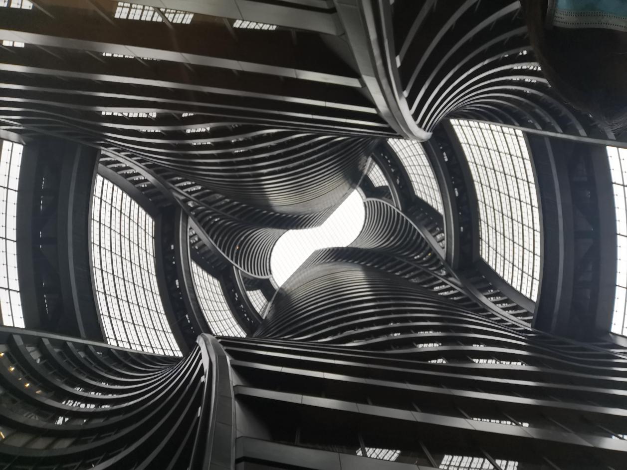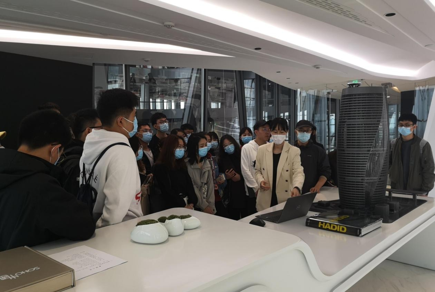 段雪昕引导师生们先后抵达不同楼层,详细讲解丽泽SOHO在空间、结构、材料、构造节点等方面的特色。在一层中央大厅,她重点讲述“DNA双螺旋”复杂结构的由来与设计;在大楼顶层,她进一步分享了主体建筑的细部考量,包括通风、公共空间的相互联系以及核心筒的布局等,同学们环绕顶层尝试了360度俯瞰北京城的新奇体验;在位于31层的华为5G实验室与会议室样板间,师生们体会了科技与建筑结合所带来的极具冲击力的视觉感受。