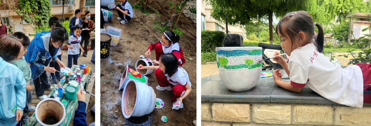 5月23日,团队深入现场和社区居委会等工作人员一起参与营建之前的准备工作,完成现场参与翻土、卵石铺路、放线。同期举办的“花盆新生”彩绘活动中,十余名社区儿童在风景园林系员工指导下,使用环保丙烯颜料在回收花盆上创作。这些充满童趣的作品作为特色景观元素融入微花园设计。团队以专业的指导,让社区儿童参与到项目中来,不仅为微花园增添了独特魅力,更提升了社区居民对项目的参与感和认同感。