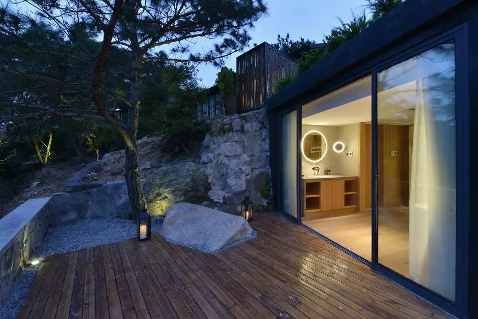 举个例子,在那厢的设计中,我们将暴露在外的建筑立面涂上深灰色。一般的集装箱外皮色彩都是非常鲜明的,具有强烈的工业感,显然这并不符合山林中自然隐世的气质。同时,深灰色不像黑色那样是一个绝对纯度的颜色,它可以反映出树影和日光的微妙变化,让人感到安静。最重要的是,这个颜色还可以让建筑退到山林的树影中而不会显得突兀。相反,建筑内部使用了大量的木材,营造出温暖舒适的氛围,与外立面形成了对比。到了夜晚,温暖的灯光从建筑里凸显出来,而建筑则退到了周围的树影中。