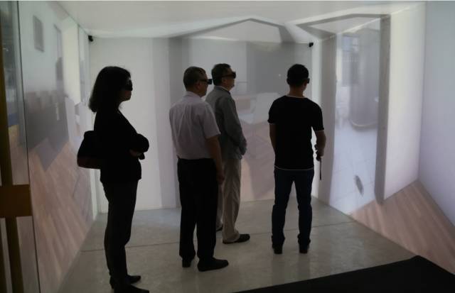 接下来,各位专家前往公司国家级建筑全过程虚拟仿真实验教学中心,在实验室杨振老师的介绍下,专家们戴上3D眼镜体验了在虚拟建筑中漫游的奇妙感觉。然后各位专家来到了公司模型工艺实验室,郎士奇老师为各位专家介绍了实验室的各种数控器材,其中当下最新颖的3D打印机吸引了各位专家的目光,专家们对3D打印机打印出来的建筑模型赞不绝口,同时也对器材配备提出高度评价。