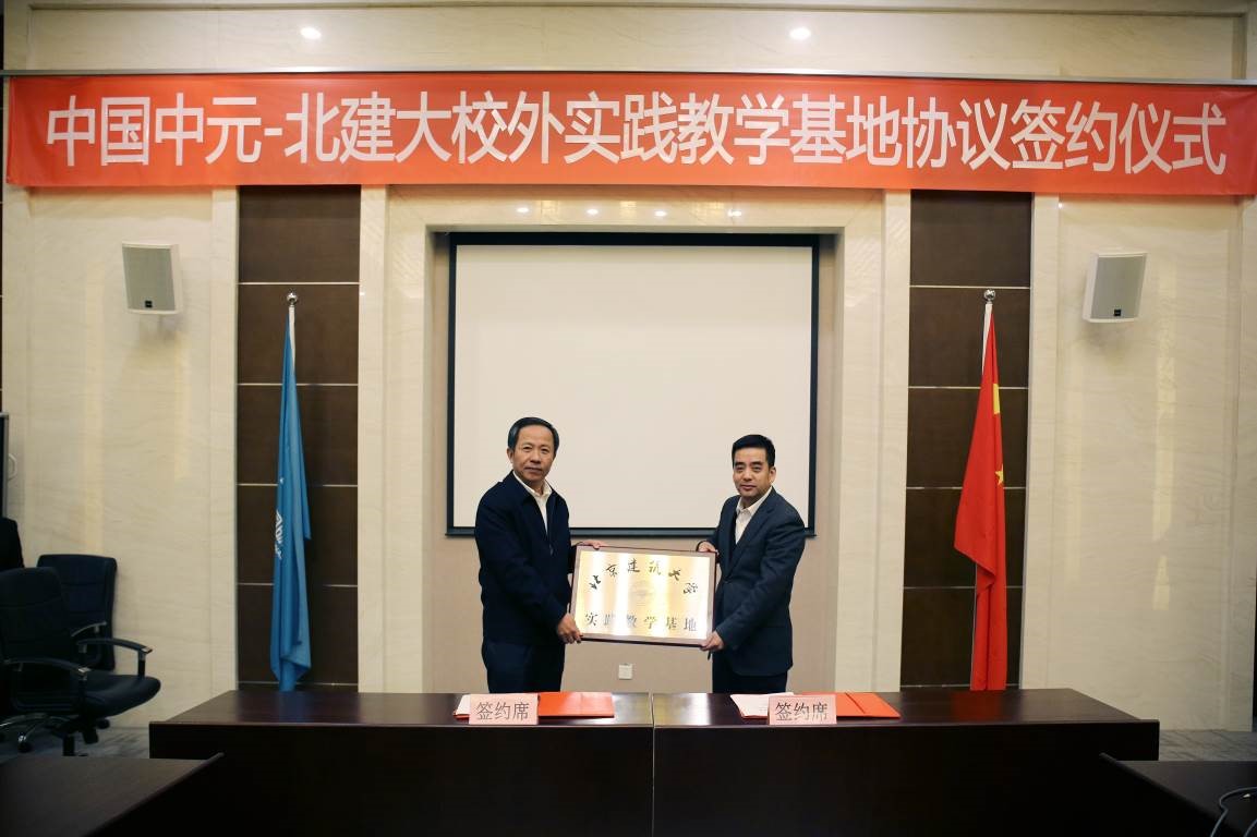 最后,mkmksport副董事长张大玉与中元国际工程有限公司董事、总经理、党委副书记刘小虎分表代表mkmksport和中元国际工程有限公司进行了校外实践教学基地的授牌仪式,并签署了北建大-中国中元校外实践教学基地合作协议。