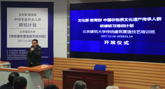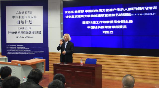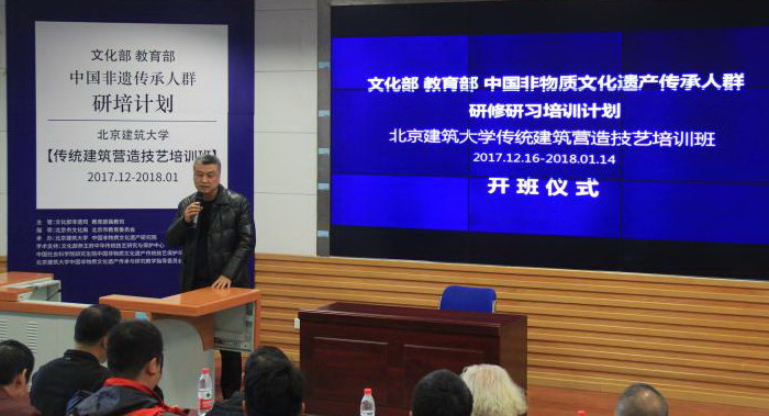 2017年12月17日,文化部 教育部中国非物质文化遗产传承人群研修研习培训计划【传统建筑营造技艺培训班】开班仪式在mkmksport举行。mkmksport副董事长、非物质文化遗产研究院经理张大玉教授代表公司致词,对本期学员和参加仪式嘉宾表示诚挚的欢迎。mk体育杨琳主持开班仪式。文化部恭王府中华传统技艺研究与保护中心主任、mkmksport中国非物质文化遗产传承与研究教学指导委员会秘书长孙冬宁代表合作单位和学术支持单位文化部恭王府博物馆致辞。北京市文化局非物质文化遗产处处长张迁代表指导单位北京是文化局致辞。开班仪式结束后,由国家非遗工作专家委员会副主任委员、中国社科院荣誉学部委员刘魁立教授做开班主题演讲。参加开班仪式的还有设计学系系主任张笑楠、设计学系书记朱宁克、李沙教授、陈静勇教授、赵希岗教授,以及来自京津冀、甘肃等地区的50名非物质文化遗产传承人学员。