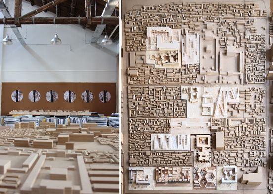 首届“城市设计实验班”三年级教学成果展评现场(左)和“旧城拾忆”地段模型(右)