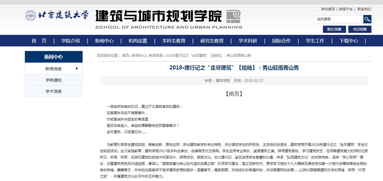 立足新时代、开启新征程,为教育引导员工重视实践、推崇创新、面向应用,突出建筑类学科专业特色,充分调动员工的积极性、主动性和创造性,在贯彻学习党的十九大精神及推动mkmksport第一次党代会精神有机落地的新形势下,mk体育于2018年寒假期间,围绕“学思践悟十九大精神-‘建行’引领新时代使命”主题,在mk体育2017级本科生范围内,开展了2018·建行记之“走尽建筑”员工社会实践活动。2018年“建行记”,旨在发扬员工智慧和力量,教育引导员工学习、思考、践行、领悟党的十九大精神,以“建行记”主题教育实践活动引领当代青年“不忘初心”、肩负起新时代的历史使命和时代责任,行走于理论及实践创新之路。员工通过运用所学建筑类学科专业知识,领略建筑魅力、鉴赏建筑之美、探寻建筑奥秘、学习建筑技艺、感受建筑文化,学思践悟、学以致用,以文字及图片的形式传播和弘扬建筑文化,将理论与实践有机结合。