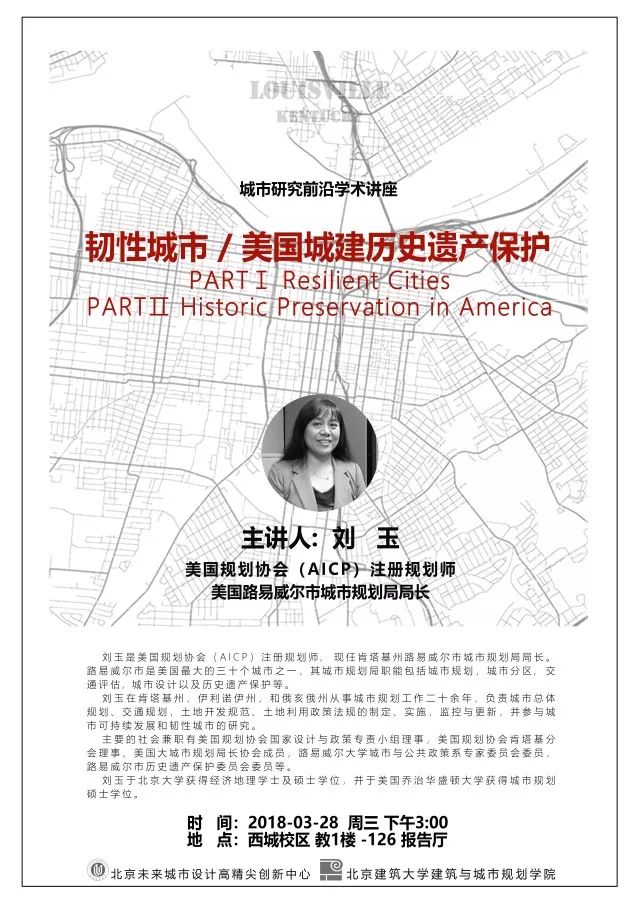 2018年3月28日星期三下午,美国路易威尔市城市规划局局长刘玉女士在mkmksport西城校区教1-126报告厅做了题为《韧性城市 / 美国城建历史遗产保护(Resilient Cities & Historic Preservation in America)》的学术讲座。mk体育副经理胡雪松教授,北京未来城市高精尖创新中心主任李雪华教授和广大师生到场聆听,讲座由建筑系(含基础部)副主任李煜老师主持。