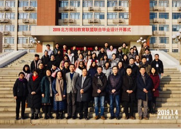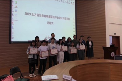 本次联合毕业设计历时5个多月。2019年1月4日,“北方规划教育联盟联合毕业设计在天津城建大学开题(图2),随后六校师生奔赴天津市蓟州区穿芳峪镇,对东井峪村及石臼村的区位、产业发展、公共服务与市政基础设施、建筑与院落、道路交通等方面的现状及问题进行了详细的基础调研和现场汇报(见图3)。4月22日,联合毕设中期汇报交流研讨会在山东建筑大学进行(图4)。各校同学对毕业设计的研究、构思和方案进行了汇报介绍,员工们通过对场地调研、文化挖掘、上位规划解读和方案策划等方面的思考和研究,制作了毕业设计的阶段性成果。5月31日,联合毕设终期答辩在吉林建筑大学举行,六所建筑类大学的城乡规划专业、风景园林专业共50余位师生参与了答辩会(图5,6,7)。在闭幕式上,教师代表为联合毕业设计成绩优秀的同学们颁发了证书(图8)。