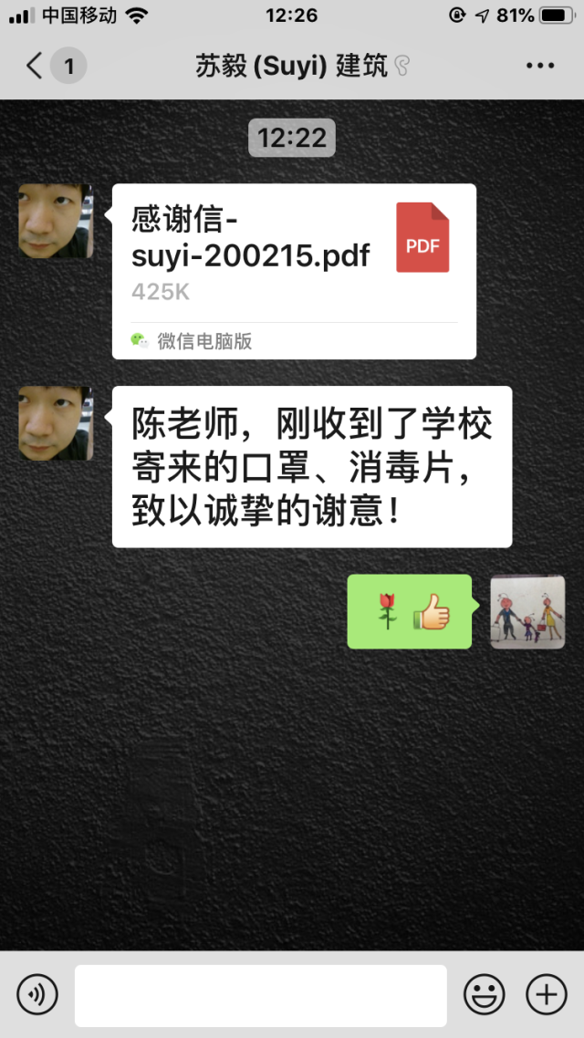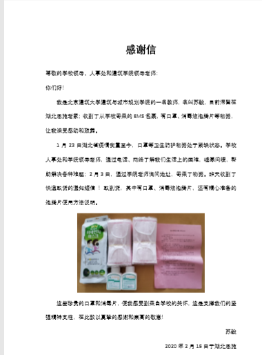 mk体育对公司唯一在湖北地区的苏毅老师,从疫情开始,表达牵挂和关心。每天询问身体情况,党委书记何立新同志亲自联系爱心邮包,规划系系主任荣玥芳教授和规划系支部书记孙立教授代表系和支部表达了关心关爱。2月15日,mk体育收到来自mk体育滞留在湖北地区的苏毅老师的感谢信。在信中,苏老师表达了感谢公司和公司的关怀,给了他支撑的坚强精神支柱。