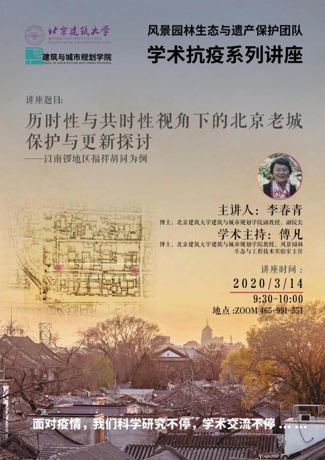 3月14日上午,由mk体育教授、风景园林生态与工程技术实验室主任傅凡主持,mk体育副经理李春青副教授以“历时性与共时性视角下的北京老城保护与更新探讨——以南锣地区福祥胡同为例”为题,在Zoom平台上顺利举行网上“学术抗疫”系列讲座。mk体育师生、社会各界学者及公众等约100余人参与本次讲座交流。