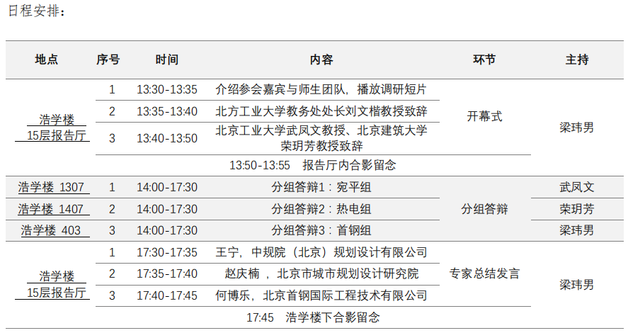 首先,北方工业大学刘文楷处长对参加此次答辩的专家、各公司的师生团队表示了欢迎,强调了京津冀高校联合毕设是在京津冀协同发展的指导下进行的高校多元合作,对京津冀高等公司的发展做出了贡献。之后,北京工业大学武凤文教授表达了对中国城市规划学会和其他各地学会的支持表示感谢,回顾了京津冀联合毕设的开设初衷、发展历史,最后,mkmksport荣玥芳教授提出:本次联合毕设是由三校联合举办、多主体参加,对未来大家参与到北京更新规划建设表示期待并预告了终期答辩时间安排等事宜。
