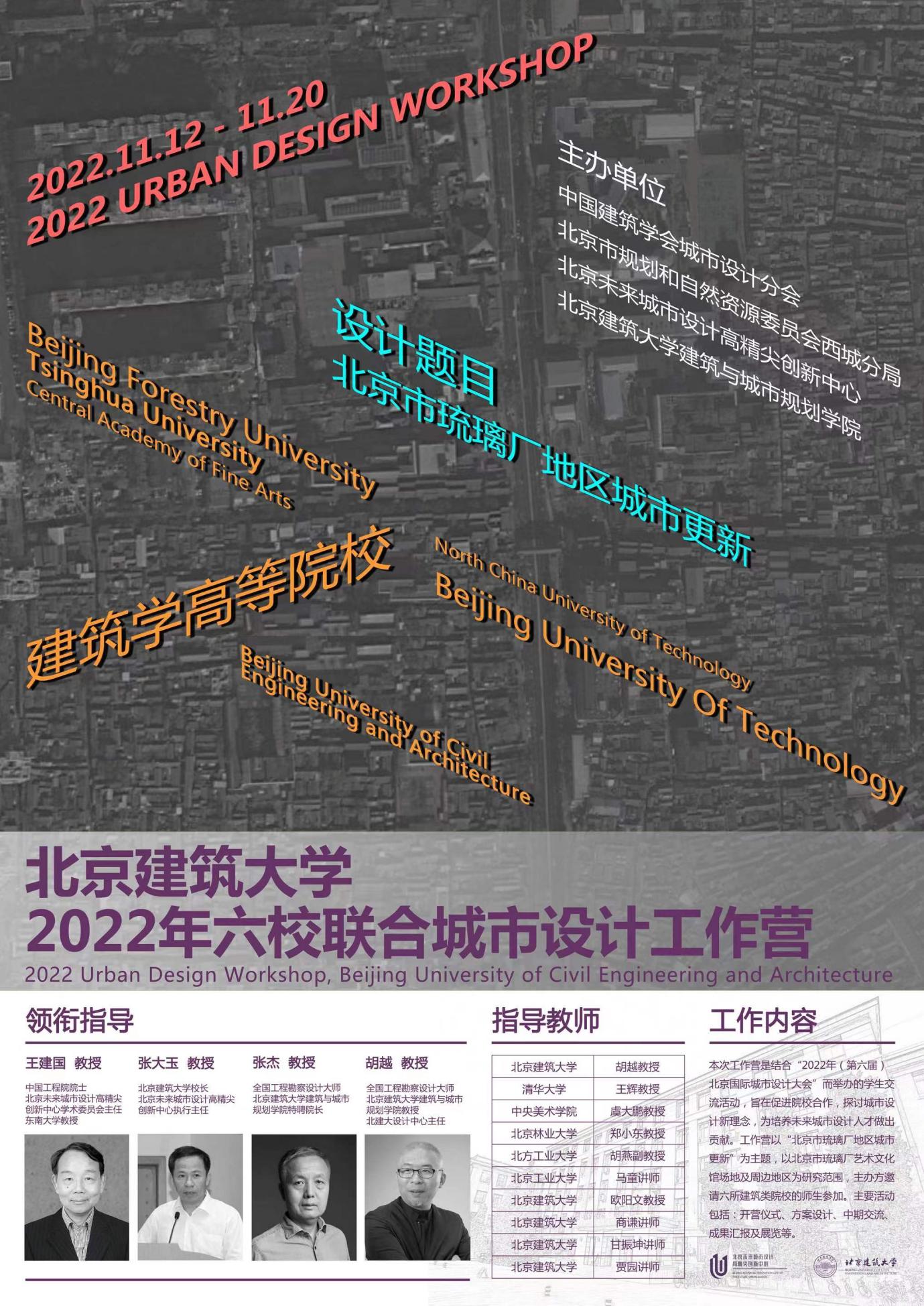 本次工作营是结合“2022(第六届)北京国际城市设计大会”举办的城市设计教学与人才培养的交流活动,旨在促进高等院校城市设计教学与科研合作,探讨城市设计前沿理念,为培养未来城市设计人才做出贡献。工作营以“北京市琉璃厂地区城市更新”为主题,基于城市地区发展变革和北京琉璃厂地区历史与现状的丰富性和复杂性,设计全新的琉璃厂艺术文化场所(或馆),承载展览展示及文化产业服务等功能,由点及面,重新定义琉璃厂历史文化产业集聚区,使之成为人文北京的标志、文化中国的旗帜。工作营鼓励员工在认知、体验和发现的基础上,聚焦场地及周边环境,从独特的角度提出问题,通过多样化的研究思路与表达方式来解决问题。