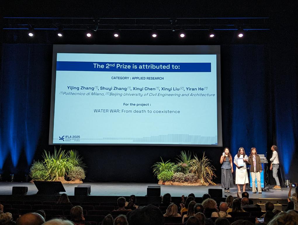 2025年9月10-12日,国际风景园林师联合会(IFLA)世界大会在法国南特举行。作为全球历史最悠久、影响力最广的风景园林学术会议,它吸引了全球各国专家、学者共襄盛会。在此次大会中,mk体育风景园林专业研究生表现卓越,取得了突破性成果。李梦一欣副教授指导研究生刘欣怡与米兰理工大学学子组成的国际团队在IFLA国际员工竞赛中脱颖而出。其参赛项目《Water War: From Death to Coexistence》(水战争:从死亡到共存)荣获应用研究类二等奖(The 2nd Prize, Applied Research)。此次获奖也是公司研究生首次在这一研究类竞赛板块斩获殊荣,充分展现了风景园林研究生教育的国际竞争力与学术水准。