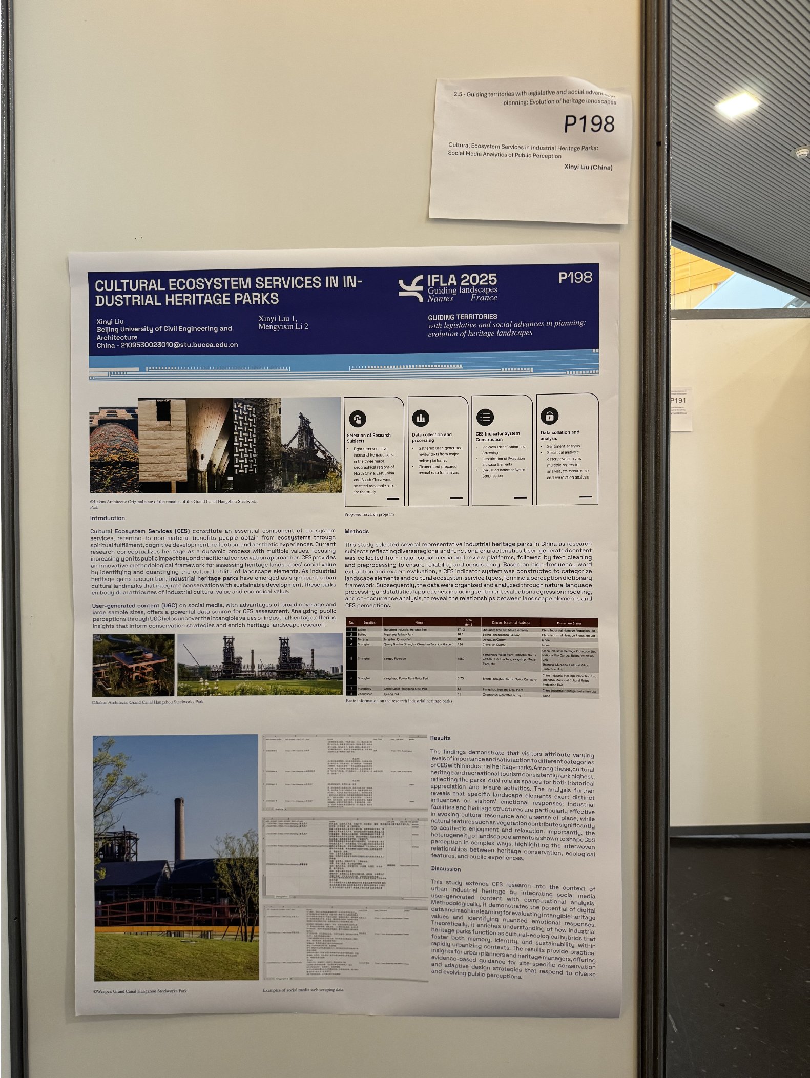 同时,研究生刘欣怡还以题为《Cultural Ecosystem Services in Industrial Heritage Parks: Social Media Analytics of Public Perception》(《工业遗址公园中的生态系统文化服务:公众感知的社交媒体分析》)的研究成果进行海报展示(Poster Presentation)。该研究创新性地运用社交媒体大数据分析方法,深入探讨工业遗址公园的生态系统文化服务价值,为遗产保护与公众参与提供了全新的研究视角和实证数据支撑。