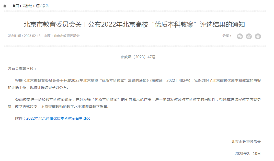 北京高校“优质本科教案”项目建设,旨在通过遴选建设一批能够体现北京高等教育优势特色、教学成效显著、示范作用广泛的优质教案,鼓励教师及时将新理念、新科技、新案例纳入课程教学之中,从而提升北京高等教育人才培养质量。2022年11月,市教委组织开展2022年北京高校“优质本科教案”项目的申报和评选工作,是该项目的首次评选,经北京地区各高校自主申报、市教委审定并公示后,最终遴选出172项面向全日制本科生的教案和28项面向继续教育的教案。