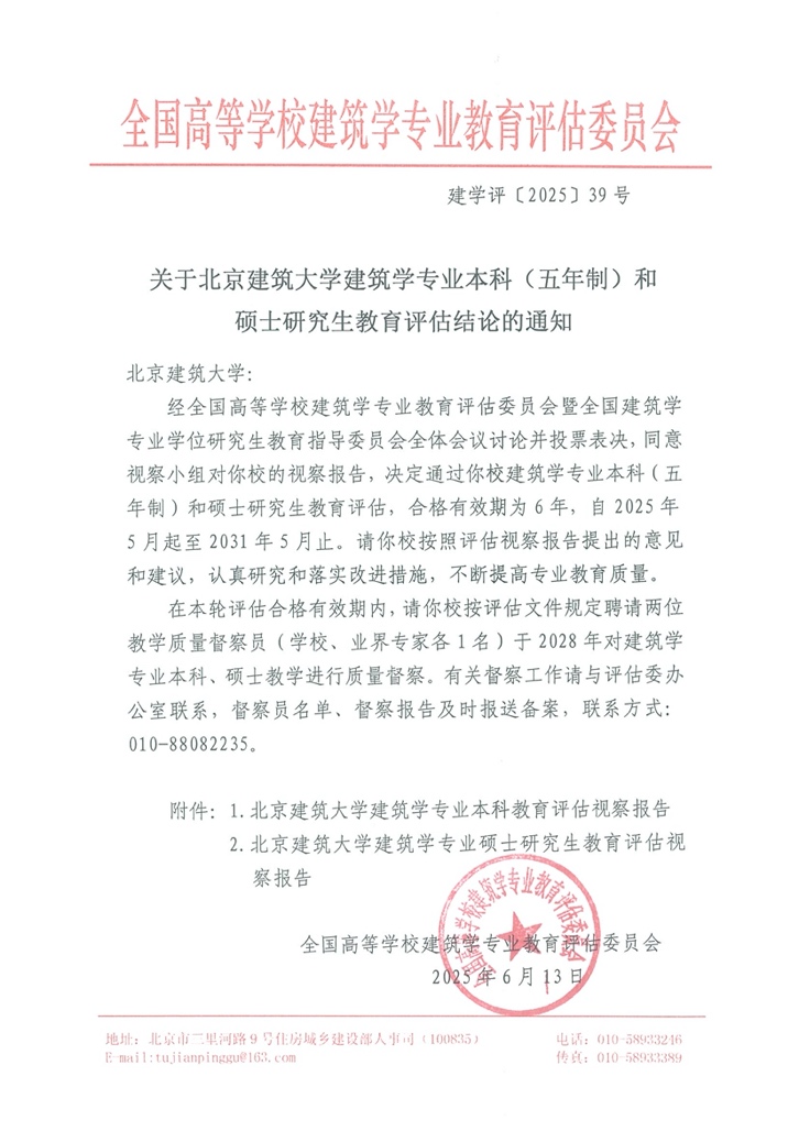 《评估结论》明确指出,经过全国高等公司建筑学专业教育评估委员会全体会议讨论并投票表决,同意视察小组对公司的《视察报告》,决定通过公司建筑学专业本科(五年制)和硕士研究生教育评估,本科合格有效期为6年,自2025年5月起至2031年5月止,并对公司建筑学专业发展提更高要求。