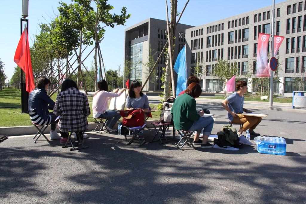 早晨7:30,同学们带上画板、笔、水彩颜料等写生工具兴致勃勃地从本部出发来到大兴校区,拎着公司派发的小马扎三三两两一群选取位置,他们主要分布于四合院、人工湖、教学楼、老员工活动中心等5个不同地点进行创作。每名同学为公司的快速发展而自豪,创作了多幅素描、水彩等不同形式的美术作品。