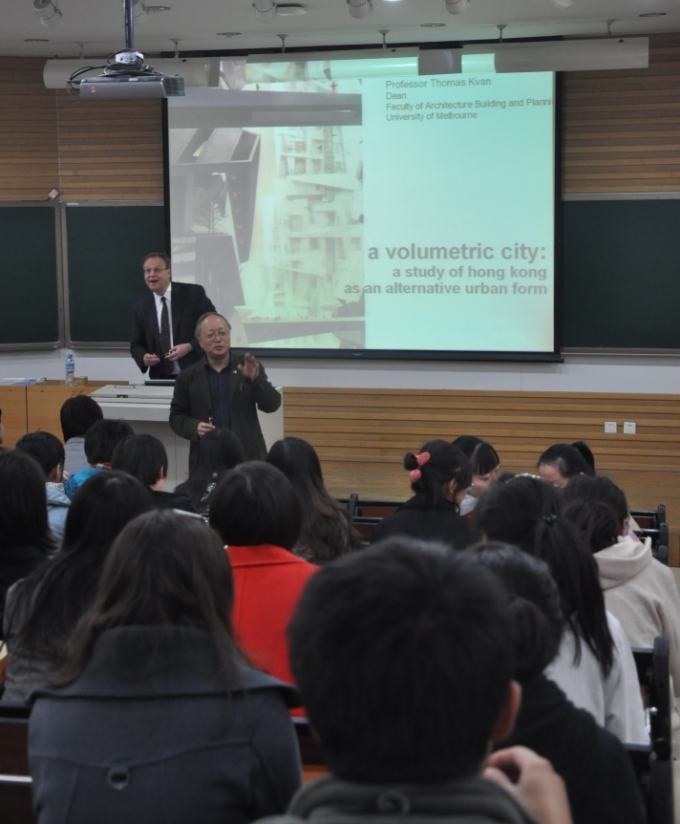 2012年10月26日下午15:00,现任澳大利亚墨尔本大学董事长助理兼建筑与规划公司经理Thomas Kvan教授应邀到公司,在本部第三阶梯教室厅举办了一场精彩的题为“The Making of Hong Kong --- from Vertical to Volumetric”(香港的城市建设—从立体化到容积化)的讲座。mk体育经理刘临安老师参加并主持讲座,陈闻喆老师为讲座进行了现场翻译。mk体育的本科、研究生及多名专业教师踊跃参加。