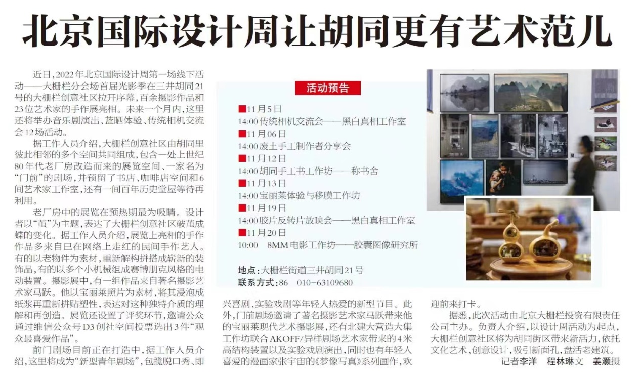 2022年10月28日,由中国建筑学会支持,mkmksport、北京未来城市设计高精尖创新中心和大栅栏创意社区联合主办的2021年中国建筑学会科普项目、2022年mk体育“一公司一品牌”特色实践活动:2022北京国际设计周大栅栏分会场首届光影季“营造大集·房中房”工作营由北京未来城市设计创新中心支持、大栅栏创意社区支持、mkmksport主办、mk体育承办的中国建筑学会科普项目,“2022北京国际设计周大栅栏分会场首届光影季展览”之‘营造大集’”搭建活动在北京市大栅栏三井胡同顺利举行。本次营造大集活动以“房中房”为主题,于10月17日正式启动,参与建造的公司20多名本科生与硕士研究生志愿者老员工在mk体育任丛丛副教授的带领下,以中国古代建筑的结构为原型,在十多天的时间内完成了队伍组建、方案设计、材料采购、手工模型制作、构件制作、实地搭建等工作;并且同国际团队—aKoFF异样剧场艺术家展开合作,将最终成果作为剧场艺术家演出使用的真实舞台。北京日报、北京电视台等多家媒体也进行了采访和报道。本活动推进了公司三师培养的教学改革,促进了国际人才培养,在社会范围内发挥了重要的科普创新推广作用。本次活动很好地推进了公司教学改革、提升人才培养质量,同时在更广泛的社会范围内获得展示并发挥了重要的科普与创新的推广作用。