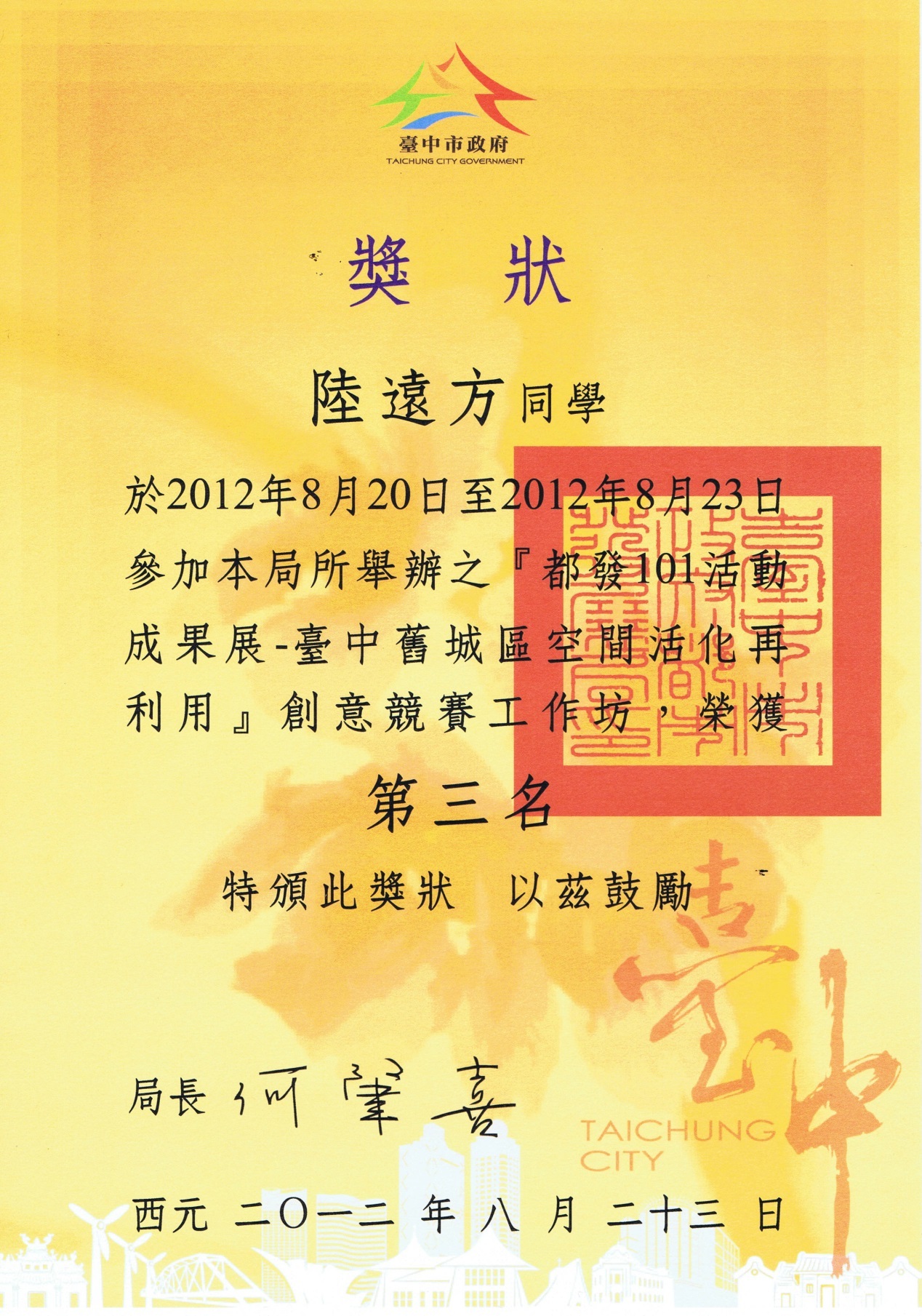 2013年3月7日由台中市都市发展局和台湾景观环境学会举办的“都发101海峡两岸旧城区空间活化”创意竞赛暨论坛中,由公司丁奇老师、蔡宗瀚老师、牛磊老师及陈栋老师指导的由王洁新、杨珊珊、于丁、屈辰、陆远方、王哲等风景园林、城市规划、建筑学多专业研究生及本科生组成的设计团队作品《脉点》获得了本次竞赛优胜奖(第3名),奖金1万元新台币。