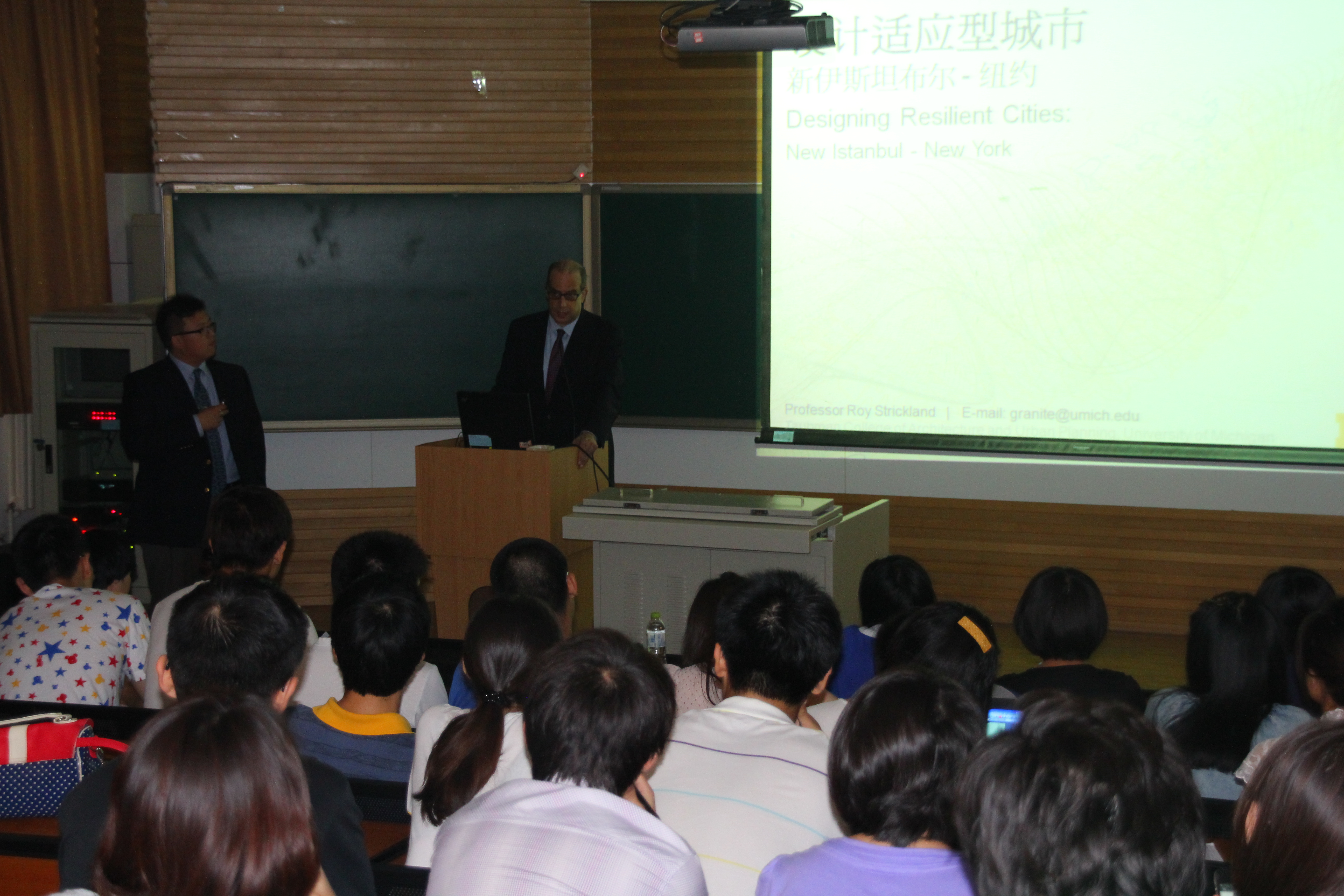 2013年6月26日,由校员工工作部主办、mk体育承办的 “我的中国梦之学术梦”系列主题教育活动中,mk体育邀请到美国密歇根大学城市设计项目创始人、建筑学终身教授Roy Strickland先生,举办了以“弹性+可持续城市——纽约与伊斯坦布尔案例”为主题的学术讲座。公司党总支副书记丁奇老师、团总支书记康健老师及广大师生参加了讲座。丁奇老师主持了本次讲座,公司05级毕业生现哈佛大学硕士钱睿做翻译。本次活动得到了《城市•环境•设计》杂志社和《中外景观》杂志社等媒体的支持和报道。
