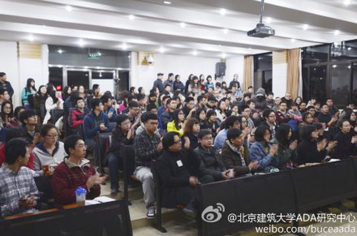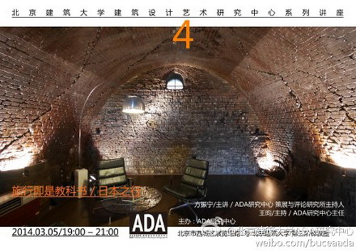 2014年3月5日在第三阶梯教室公司建筑设计艺术研究中心(ADA)举办了“旅行即是教科书”的系列讲座之四——日本之行。讲座由ADA中心主任王昀教授主持,ADA策展与评论所主持人方振宁教授主讲。上学期的前三讲在教一的多媒体教室进行,由于讲座极其火爆,导致许多同学没有座位只能站着听,故本学期的ADA系列讲座在第三阶梯教室举办,令人意料不到的是,场地的座位数翻了一倍但依旧爆满,教室两侧又站满了同学。讲座就这样在大家的高度关注之中开始进行。