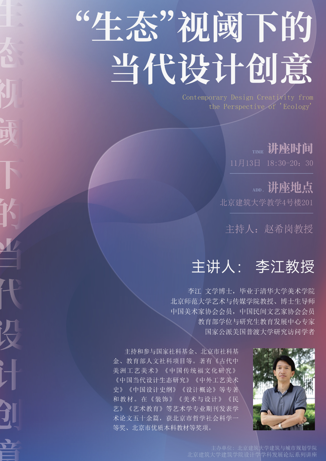 随着可持续发展理念的深入与生态文明建设的推进,“生态”已超越单纯的环境议题,成为一种重要的世界观与方法论,深刻影响着当代设计的发展方向与价值内核。为回应这一时代命题,我们非常荣幸地邀请到李江教授,与我们分享他如何在“生态”的视野下,理解和实践设计创意。讲座将从生态学视角切入重新审视当代设计,探讨其如何超越工业文明的线性思维,回归对人自身价值与生活方式的精神关照、以服务为核心融入生产与生活、实现传统美学精神的当代转译,以及从培养熟练“工匠”完成塑造有思辨力的“创见者”的转向。