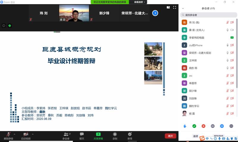2020年6月9日上午9点,城乡规划系15级毕业设计答辩在ZOOM会议室进行网络答辩。本次答辩对象为桑秋老师课题组的同学们,答辩的课题是巨鹿县概念规划。参加此次答辩工作的指导教师有桑秋老师、荣玥芳老师、刘玮老师、刘剑锋老师、杨震老师、陈晓彤老师以及校外指导专家郭少锋老师。