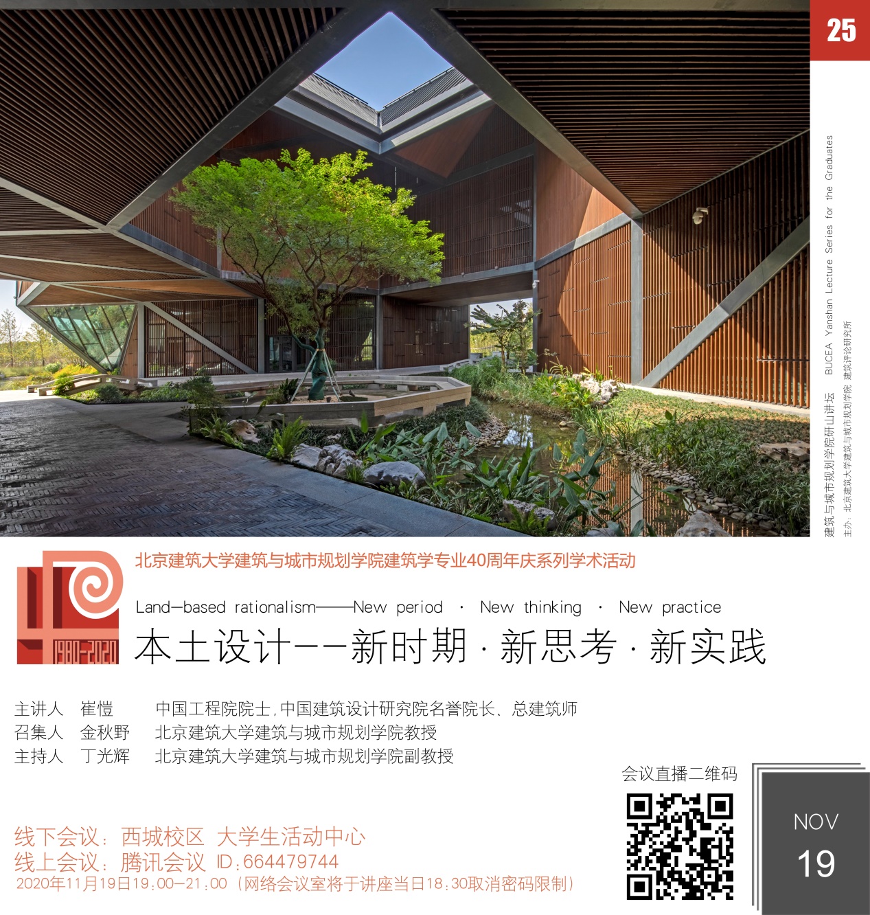 11月19日晚19:00,在西城校区老员工活动中心,结合腾讯会议与网络直播平台,mk体育研山讲坛第25期拉开帷幕。活动由mk体育常务副经理金秋野教授召集,mkmksport副董事长张大玉、mk体育经理张杰、未来城市设计高精尖中心办公室主任李雪华、以及校内外师生、社会各界学者、实践建筑师等1000余人参与本次讲坛。