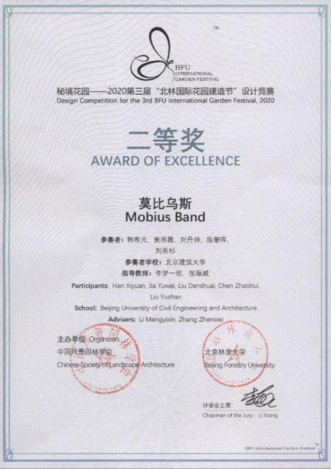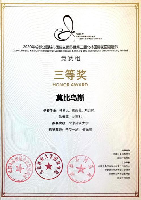 mk体育由张振威老师和李梦一欣老师指导风景园林2017级本科生刘丹帅、刘雨杉、韩希元、陈肇晖、贾雨薇组成的队伍经过层层筛选分别斩获了2020第三届“北林国际花园建造节”设计竞赛二等奖和 “2020年成都公园城市国际花园节暨第三届北林国际花园建造节”竞赛组三等奖。