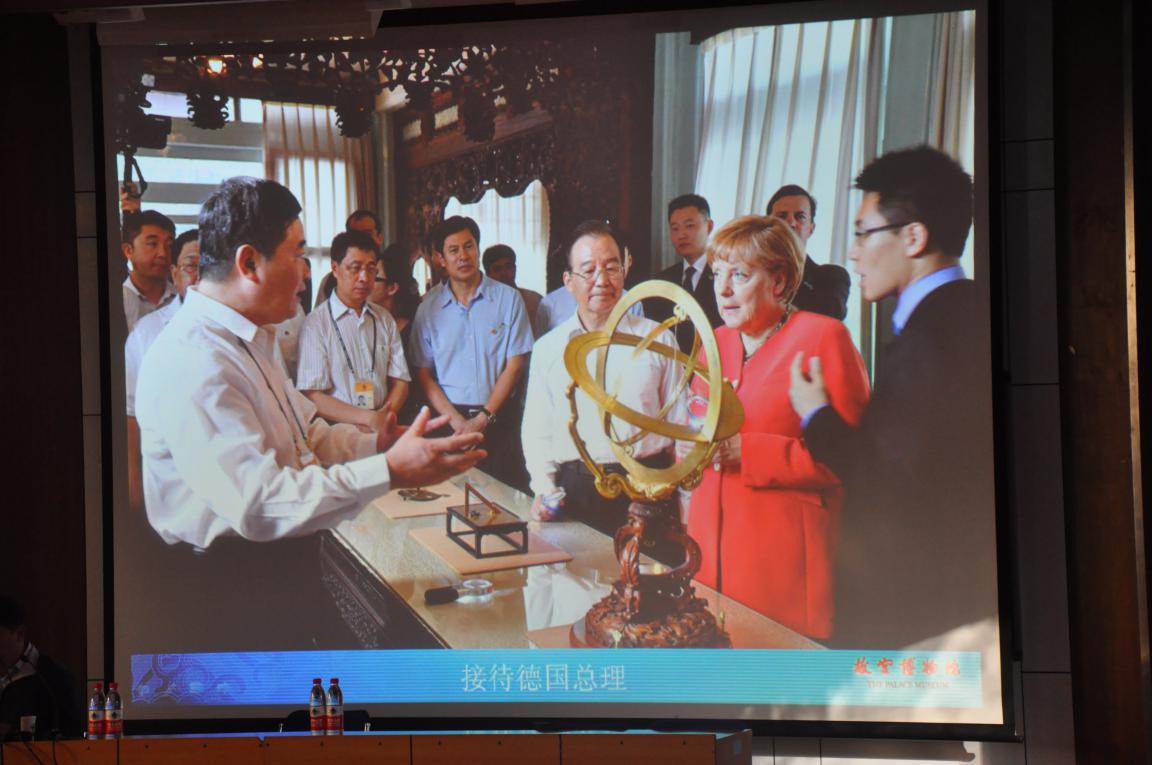 随着会场灯光渐渐暗下,单经理通过幻灯片的形式将故宫的整体面貌清晰地呈现在了大家的面前。其清晰的轴线、开阔的格局、壮美的建筑、严谨的形制、绚丽的彩绘、生动的空间、精美的装饰、独特的色彩、真实的信息、典雅的园林、丰富的景观、和谐的环境都让人深深感受到故宫与其它国家,其他城市建筑的不同。人们的目光牢牢地聚焦在前方的大屏幕上,看着故宫走过了六个世纪的点滴变化,纷纷为故宫的雄伟壮丽所震撼。与师生们一起穿梭于时间长河的单先生脸上也不时闪现身为“故宫掌门人”的自豪笑容。他深情地说道:“故宫绚丽的色彩,不仅仅是因为油漆的功劳,更是因为那种色彩是历史的沉淀,是中国传统文化的一种象征。