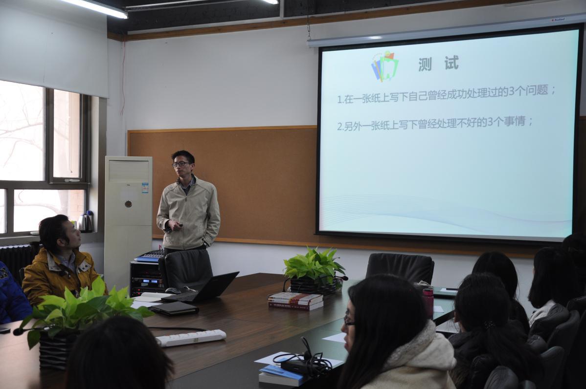 接着牛磊老师针对研会工作举办“一生只做八件事让生命怒放”的培训讲座。牛磊老师首先由一个小测试切入,深入讲解如何建立幸福人生的思考模式。小测试要求所有员工写下三件成功处理的事情和三件处理不满意的事情。随后牛磊老师针对小测试剖析到往往工作的不顺利和生活的不幸福是由于过分关注的是阻碍而不是目标,并讲述最大的阻碍是来自于内心的不自信,主要由能力方面、可能性方面和资格方面的不自信导致的。由于内心的不自信而导致成功道路中会出现畏惧心理,而畏惧心理分别是害怕梦想,害怕失败,害怕不被人接纳和害怕冲突。由于各种畏惧心理的存在,遇到事情后往往存在“这件事本应如此”的心态,将事情和责任托付他人的心态,抱怨身边一切事物的心态。然而建立幸福人生的思考模式必须改变错误的思考方式和这些消极心态,改变从三项自我暗示开始。暗示自己必须相信这件事能够被改变,暗示自己必须相信这件事必须得改变,暗示自己能改变且必须改变这件事。牛磊老师借用一段话“如果这一生都在感受抱怨,那么这一生就是抱怨的一生;如果这一生都在感受感动,那么这一生就是感动的一生;如果这一生都在立志改变世界,那么这一生就是斗士的一生。”告诉我们幸福的人生首先得改变自己的思维方式。