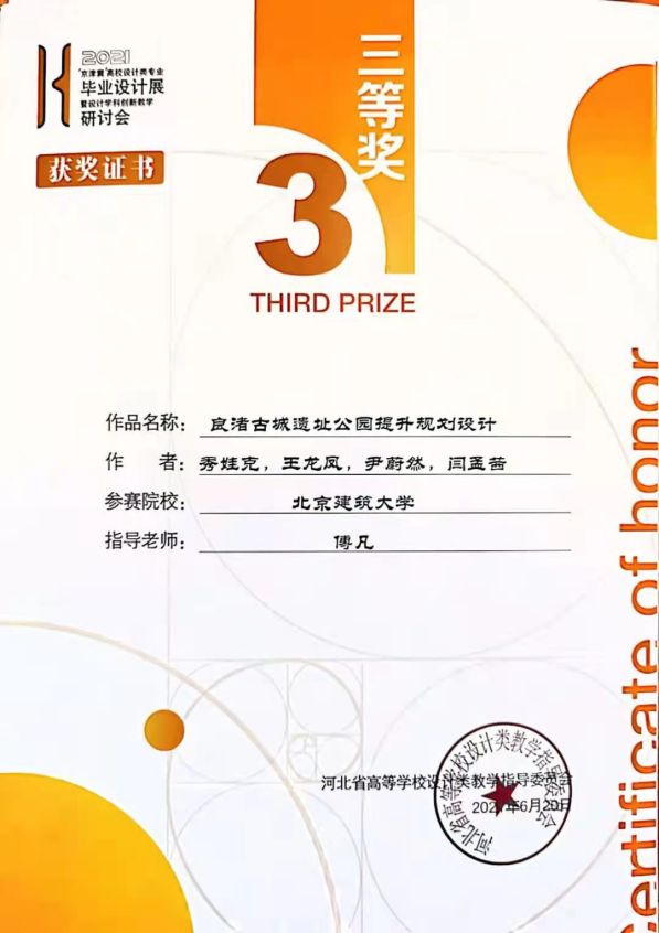 2021年6月19日,由河北省高等公司设计类教学指导委员会承办的第三届“2021“京津翼”高校设计类专业毕业设计联展暨设计学科创新教学研讨会在河北建筑工程公司召开。在“人、物、自然—和谐共生”竞赛主题中,mk体育风景园林专业本科生生郭旭、张丹雯、刘明君完成的“传承·激活—良渚古城遗址公园景观深化设计”获得二等奖,本科生闫孟茜、秀娃克、尹巍然、王龙凤完成的“良渚古城遗址公园景观提升规划设计”获得三等奖,指导教师为傅凡教授。