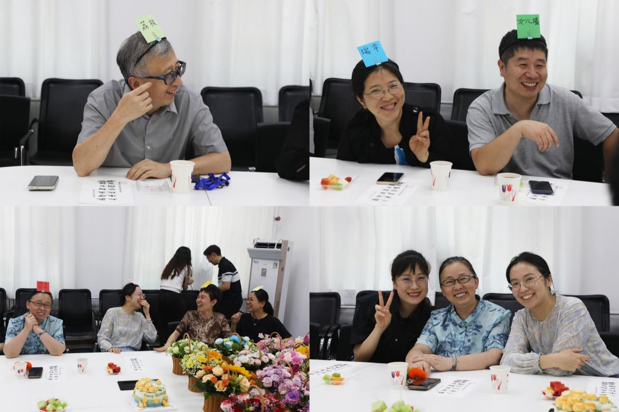 本次生日会特邀嘉宾朱宁克老师为各位寿星们颁发“生日福笺”,并向六月生日的每位老师送上了诚挚的祝福。2025年度的“生日福笺”由丁奇老师书写:岁序更新吉祥日,人生悠悠情更浓。主持人向老师们介绍了16盆五彩缤纷的花篮,让大家共同鉴赏六月的色彩。随后,主持人安排了以校园生活和建筑元素为主题的“头顶猜字”游戏,各位老师在热烈无比的气氛猜谜成功并依次选择鲜花礼物,现场沉浸在一片欢乐的海洋中。李露老师还演唱了现场填词的《一二三四五六之歌》,为老师们送上生日的祝福。随着寿星代表欧阳文老师切开本月精心准备的夏日花朵主题蛋糕,各位老师在品尝蛋糕美食过程中相互欣赏各自的生日礼物,共同度过了充满活力与童趣的夏日时光。