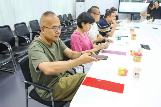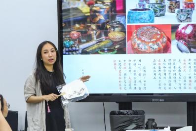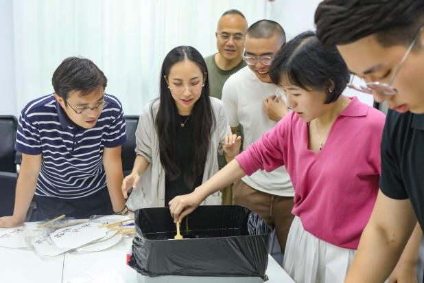 祝福之后是生日会的特别环节,李鑫老师以大漆这份传统工艺为引,向大家介绍漆扇的历史由来与制作方法,从而让寿星们在这个特殊的节日能够在古韵扇面上展现属于自己的色彩与热爱。在学习了解后,老师们亲自体验了漆扇的制作过程。活动现场充满了浓厚的学习氛围,大家围坐在一起,认真聆听、细心操作。