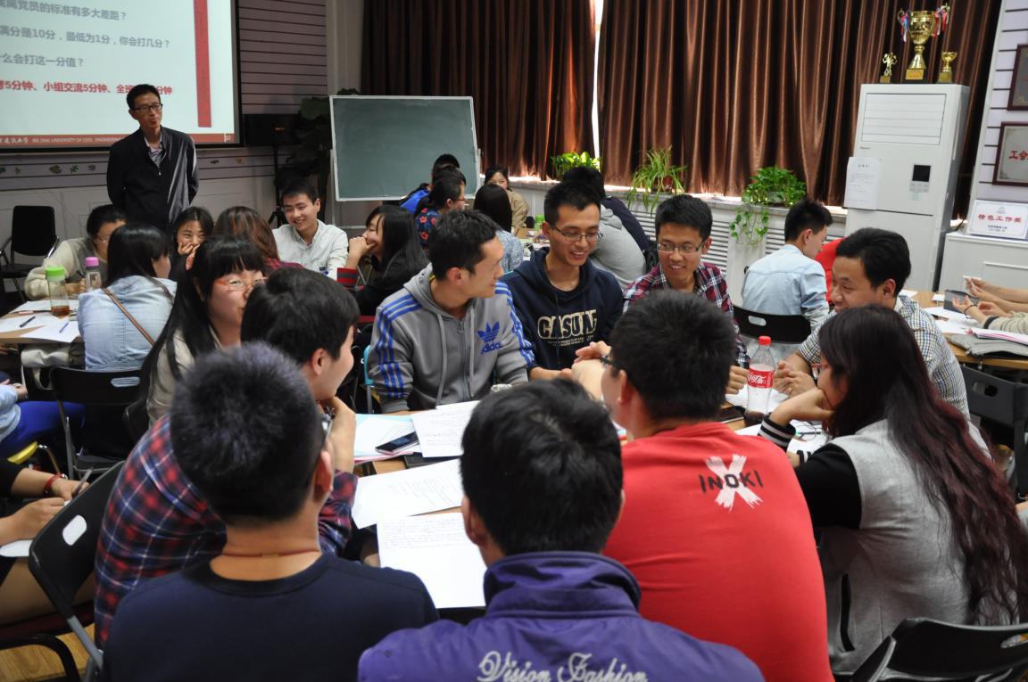 牛老师从“我是谁——所扮演角色与所承担责任”;“为了谁——我为什么要入党”;“我在哪——给自己1-10打分的分值(自己离党员标准处于1-10分几分的位置)”;“是什么——党员的标准是什么”;“如何做——为早日入党如何提升自我、如何坚持”等五方面,以小组讨论形式组织专题活动。活动中引导大家深入思考并讨论交流“一名合格的党员应当肩负什么样的责任”、“我入党的原因、今后作为党员应当为他人带来什么、在老员工活中能为班集体和公司带来什么、将来走向工作岗位能为社会带来什么价值”、“现在与真正党员的差距在哪里、如何提升”等话题。
