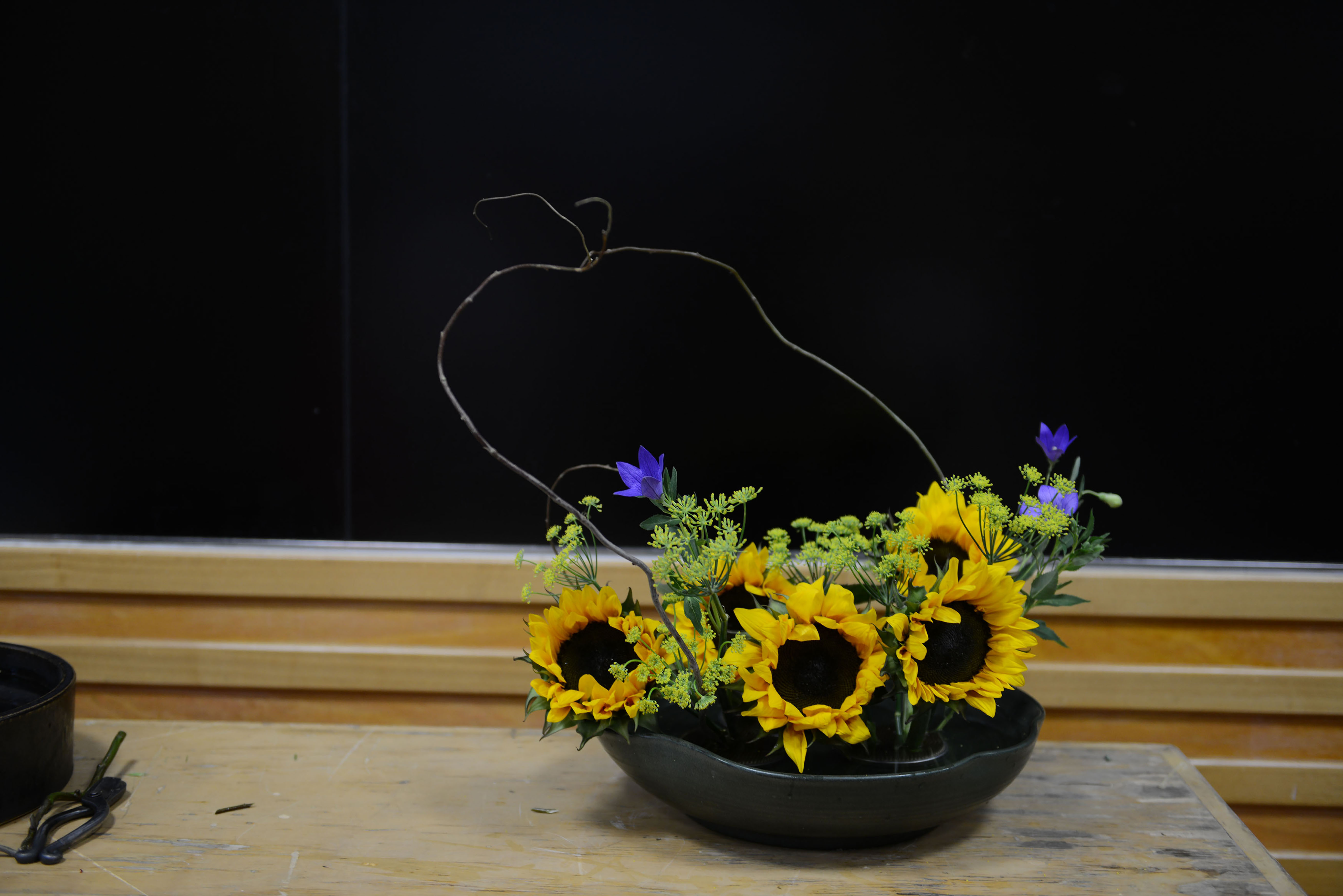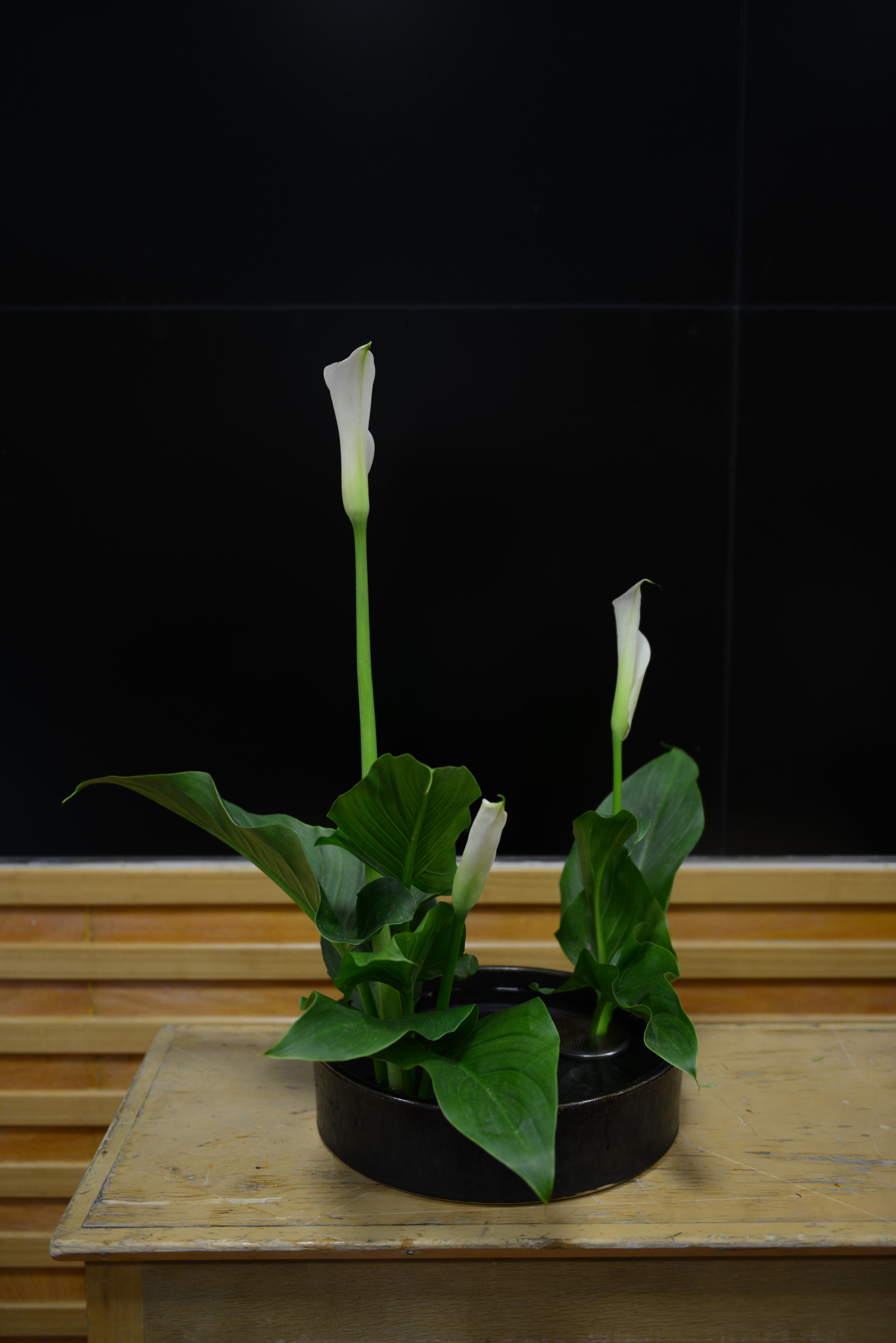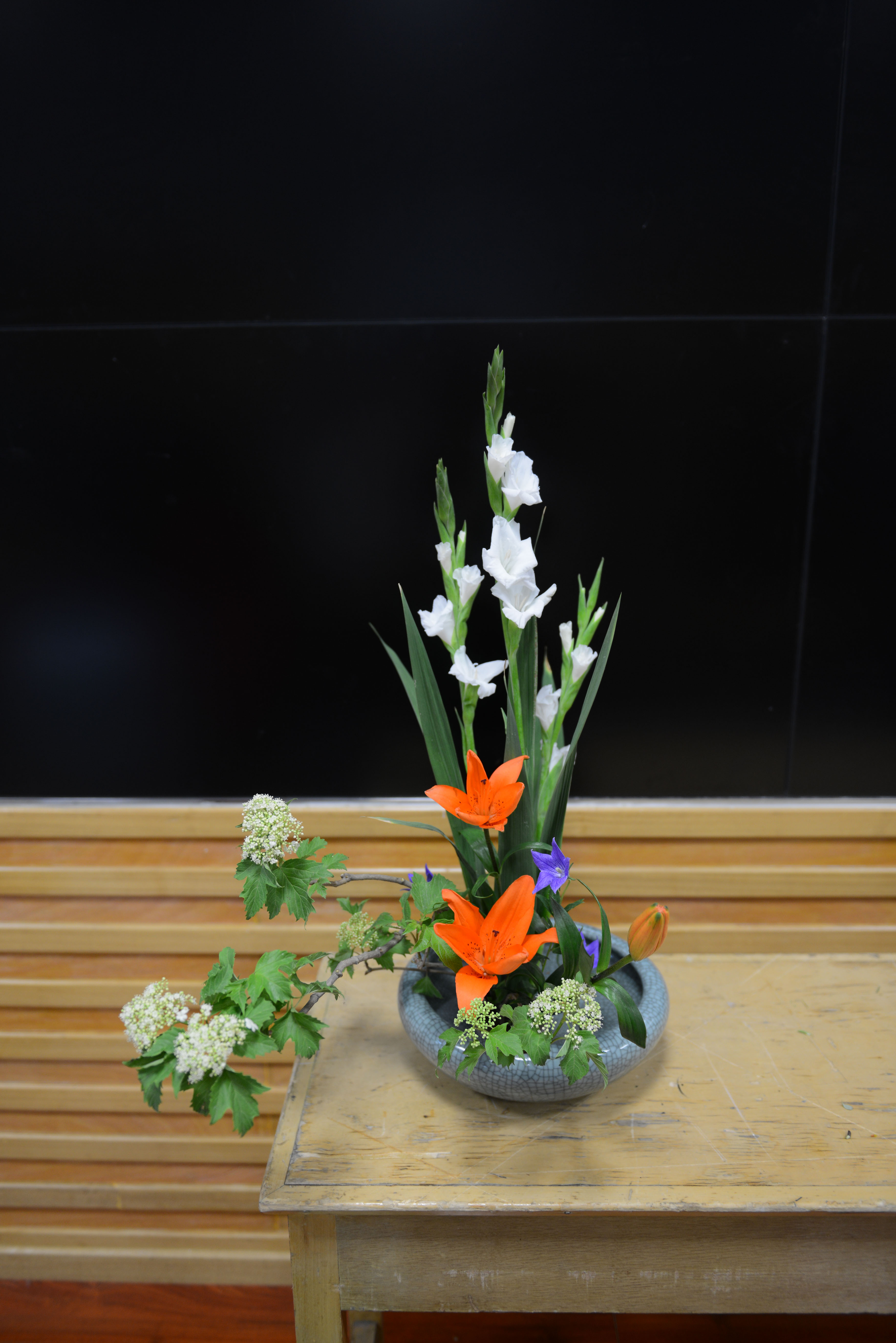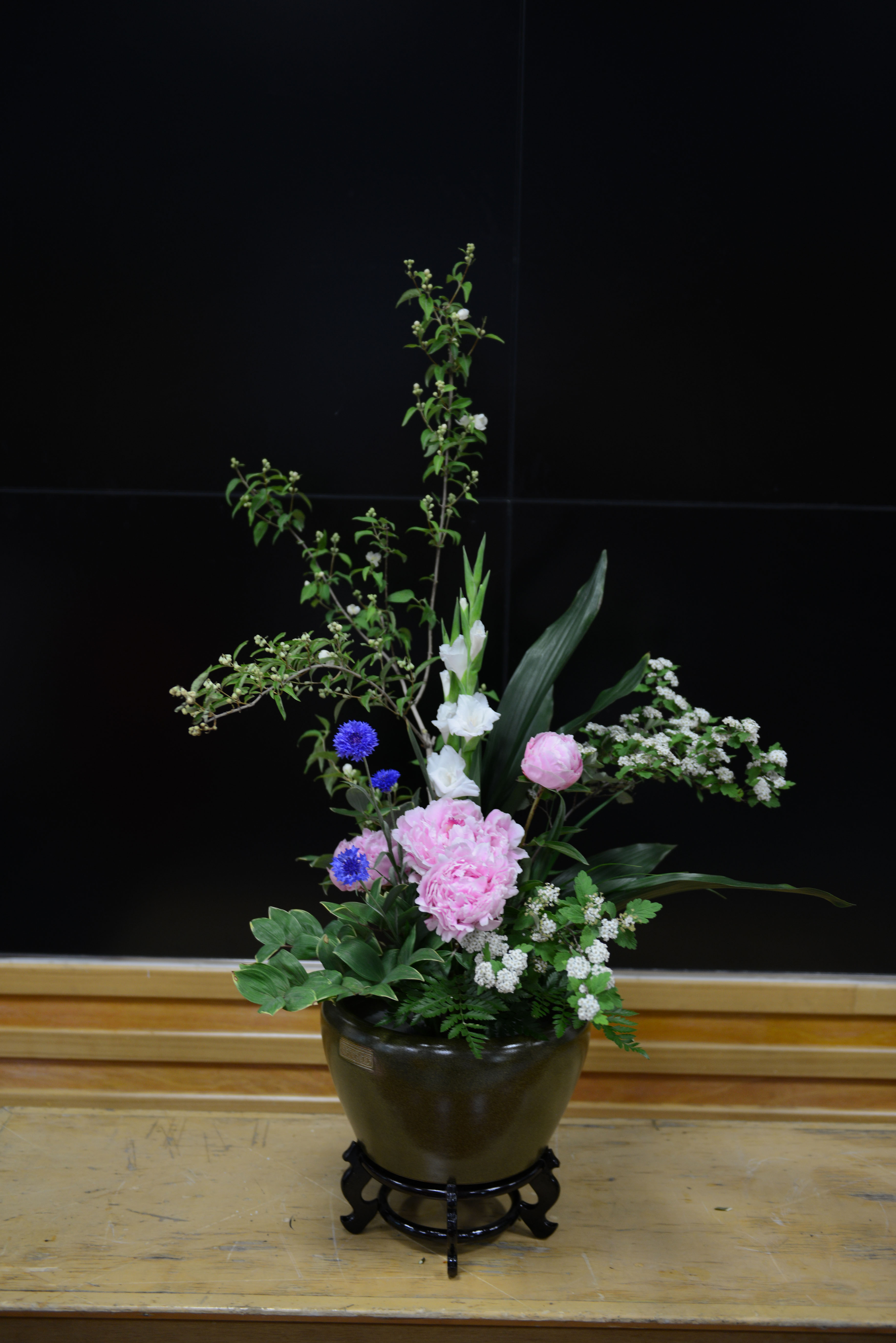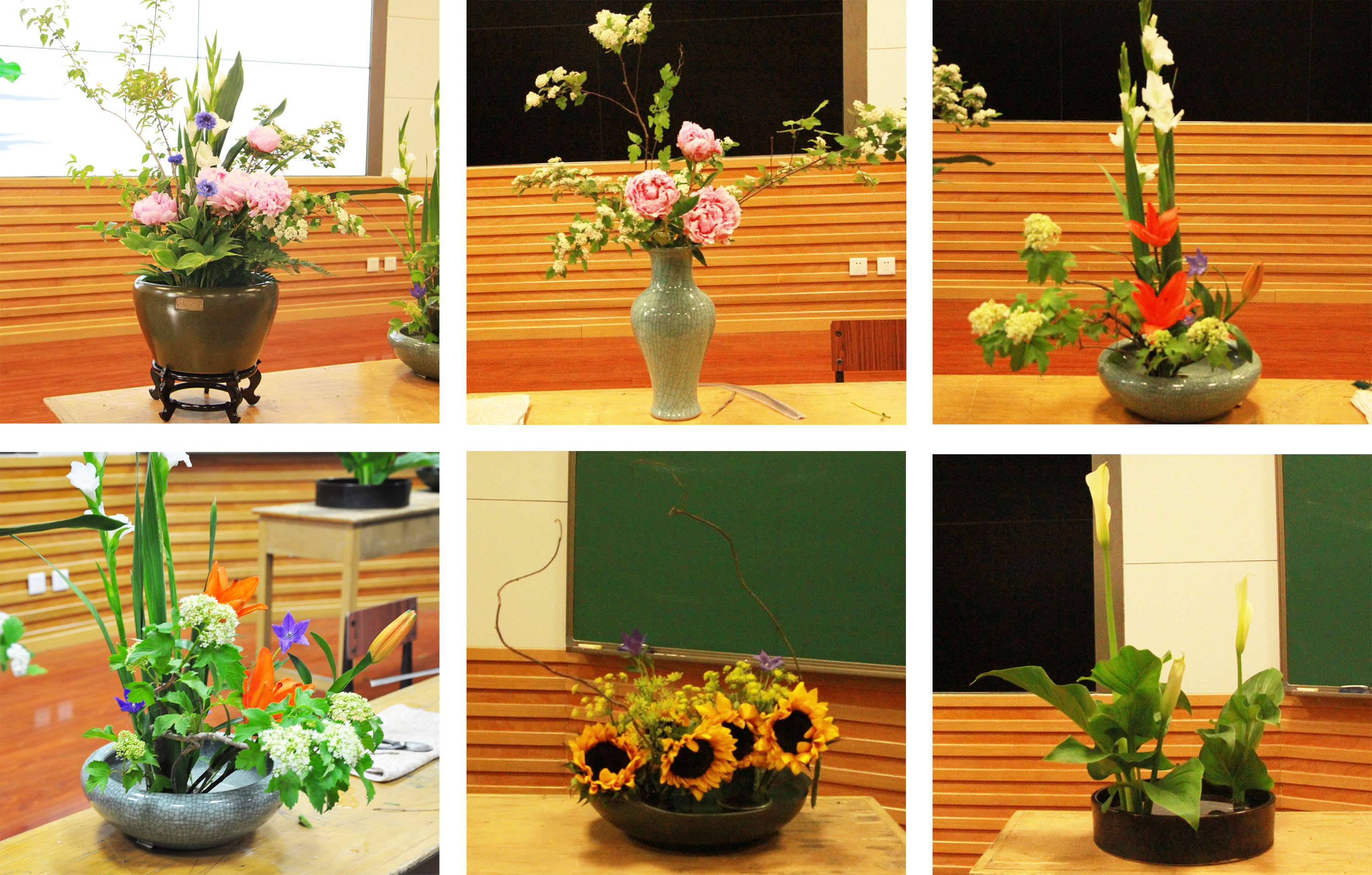 在万老师演讲期间,他先后邀请他的助教李光伟老师、肖老师、黄老师为同学们现场展示了不同的插花技法。并且在演讲结束后,老师亲自表演插花技法中最难的十全式,其精湛的插花技艺博得在场师生的阵阵掌声。