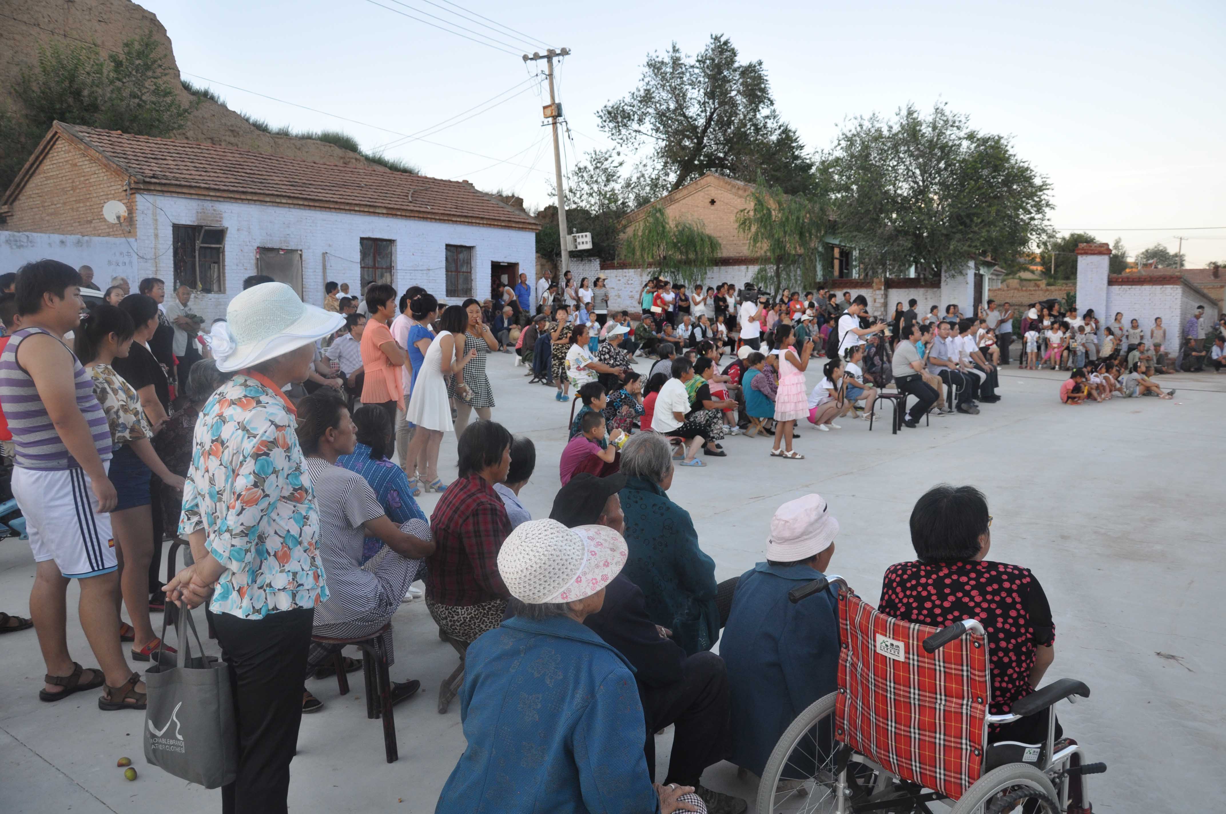 下午四点多钟,太阳还高高的挂树梢,村民就已按捺不住高涨的热情,老人们带着孩子从村里的小路上自发赶来,坐在广场的阴凉处好奇地张望着在台上忙碌的志愿者们,村干部和几个村里热心的年轻人跟志愿者们一起紧张的布置简易的舞台。傍晚时刻,夕阳挂在天边,白天的暑气还未退去,村里的老老少少100多人已经围坐在广场周边,等候节目的开演。