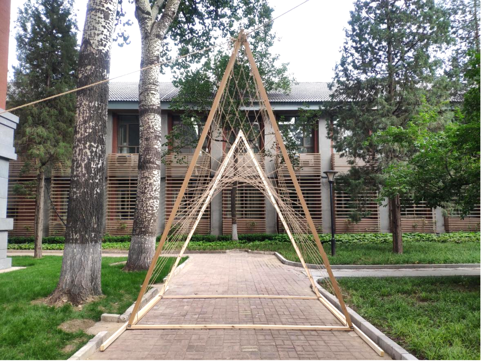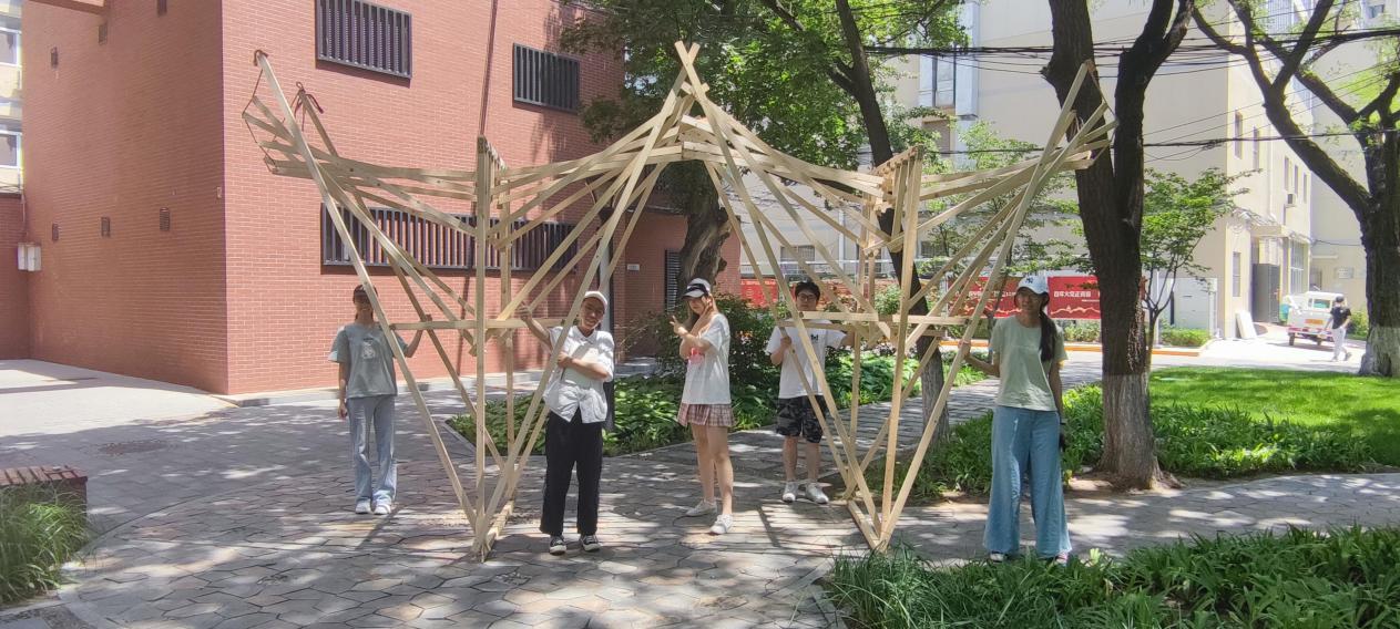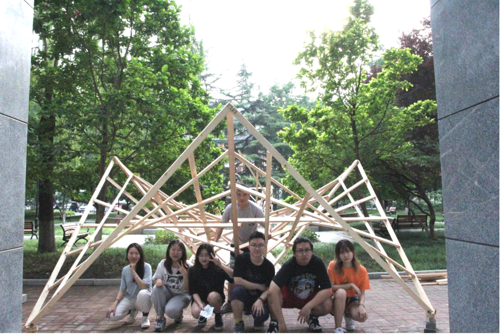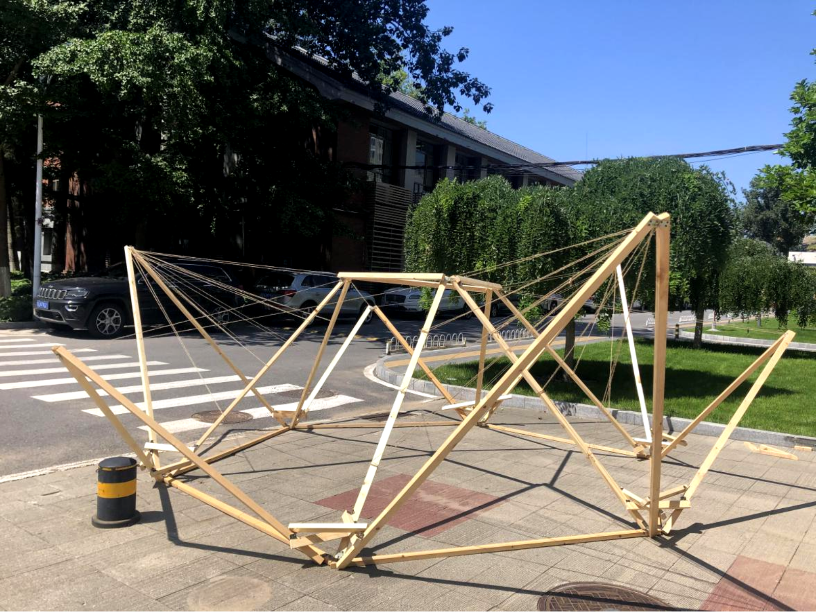 实习周具体实习任务为制作大尺度杆、曲面、组合结构模型,可以是高耸结构体系(要求占地≥1m2,高≥4m)或者大跨结构体系(要求占地≥5m2,跨度≥4m)。为保证教学质量,除本公司配备了团队外,还请来土木与交通工程公司的罗健老师及杜洪凯老师参与了指导与点评工作,从而使员工能够对作品有一个更加全方位的深入地认知。在一周的实习过程中,也的确验证了“实践出真知”的道理。个别组方案由于杆件长细比、材料本身性能或者节点处理不当等原因,在抗变形和承载力等上出现了一些问题。通过不断调整,当摇晃的作品坚固地立在校园时,员工在充分理解认可结构设计的重要性同时掌握了保证结构体系稳定性的一些技术措施,这些对于他们后续的学习帮助无疑是巨大的。