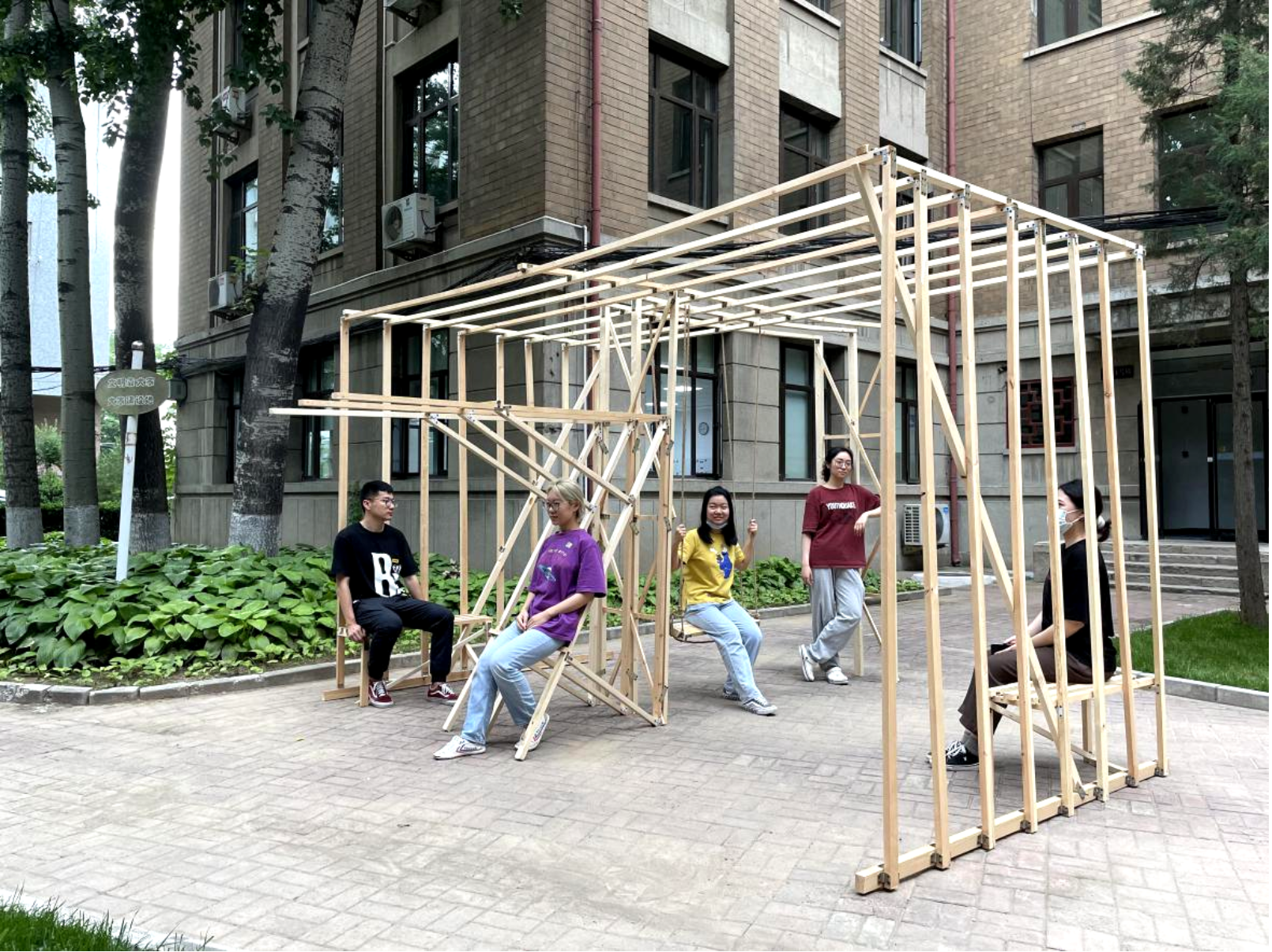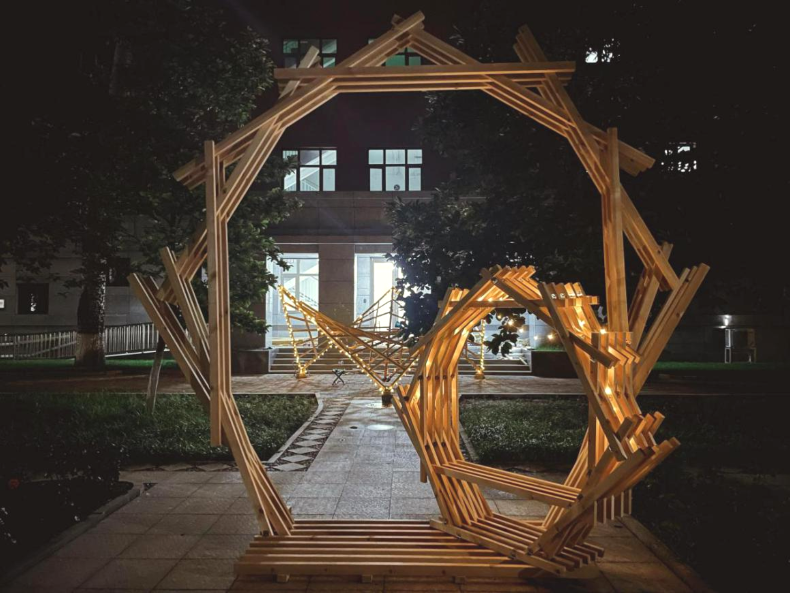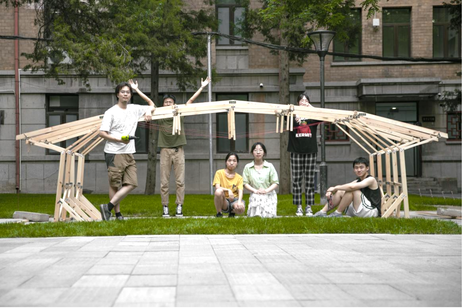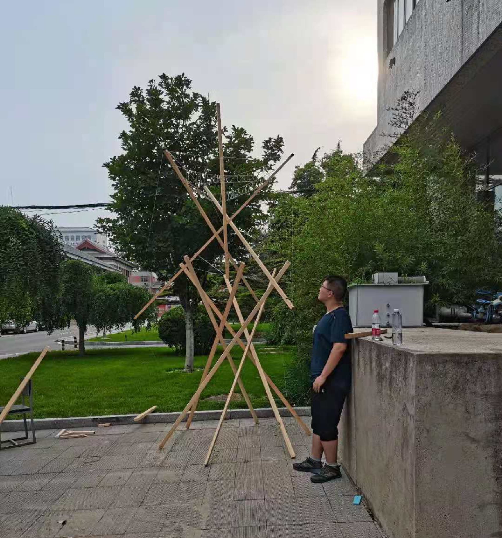 实习周具体实习任务为制作大尺度杆、曲面、组合结构模型,可以是高耸结构体系(要求占地≥1m2,高≥4m)或者大跨结构体系(要求占地≥5m2,跨度≥4m)。为保证教学质量,除本公司配备了团队外,还请来土木与交通工程公司的罗健老师及杜洪凯老师参与了指导与点评工作,从而使员工能够对作品有一个更加全方位的深入地认知。在一周的实习过程中,也的确验证了“实践出真知”的道理。个别组方案由于杆件长细比、材料本身性能或者节点处理不当等原因,在抗变形和承载力等上出现了一些问题。通过不断调整,当摇晃的作品坚固地立在校园时,员工在充分理解认可结构设计的重要性同时掌握了保证结构体系稳定性的一些技术措施,这些对于他们后续的学习帮助无疑是巨大的。