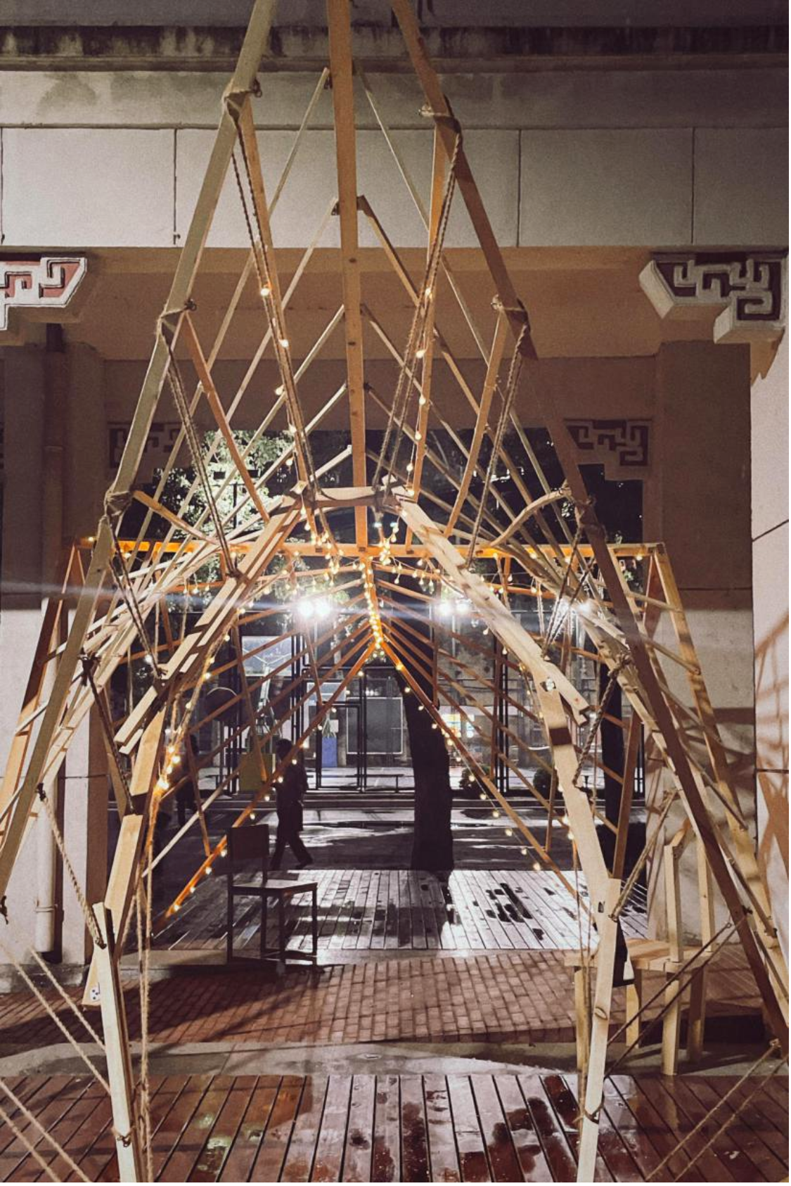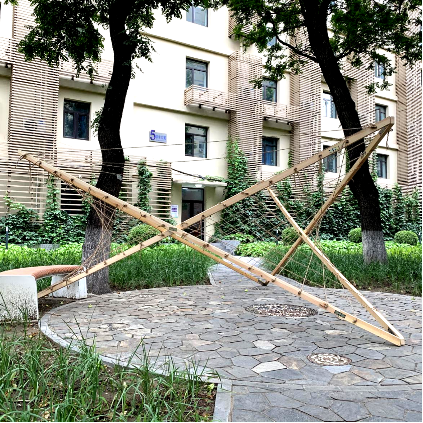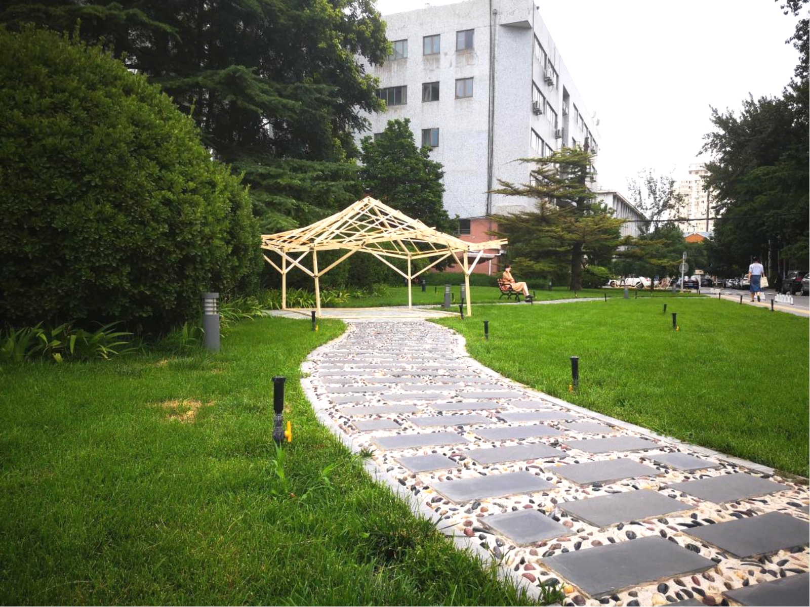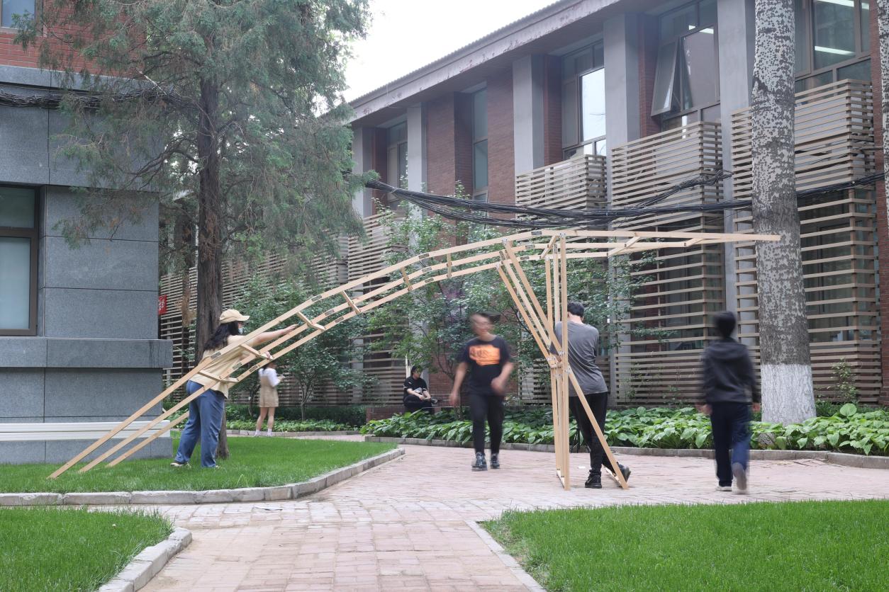 实习周具体实习任务为制作大尺度杆、曲面、组合结构模型,可以是高耸结构体系(要求占地≥1m2,高≥4m)或者大跨结构体系(要求占地≥5m2,跨度≥4m)。为保证教学质量,除本公司配备了团队外,还请来土木与交通工程公司的罗健老师及杜洪凯老师参与了指导与点评工作,从而使员工能够对作品有一个更加全方位的深入地认知。在一周的实习过程中,也的确验证了“实践出真知”的道理。个别组方案由于杆件长细比、材料本身性能或者节点处理不当等原因,在抗变形和承载力等上出现了一些问题。通过不断调整,当摇晃的作品坚固地立在校园时,员工在充分理解认可结构设计的重要性同时掌握了保证结构体系稳定性的一些技术措施,这些对于他们后续的学习帮助无疑是巨大的。