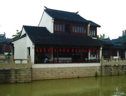 狭窄的河道和长江一比那样微不足道,却使这江南小镇多了一分温柔与恬静。而这里的建筑又不是简单的黑白灰,深红的柱与窗又点缀得小楼格外典雅。离开了写字楼的匆匆忙忙,在这典雅古朴的小楼里听一夜风雨打檐滴嗒响该是多美妙的享受。屋檐遮挡出了一方小小的天地,人坐在屋外,却又在屋里,在这里与友人喝杯茶,聊聊天,赏赏周遭美景最是合适不过。没有玻璃的阻隔,一伸手就能触碰到顺着瓦片的缝隙滑落的雨水。古时候人得了闲暇,也会在这样的环境里“矮纸斜行闲作草,晴窗细乳戏分茶”吧。