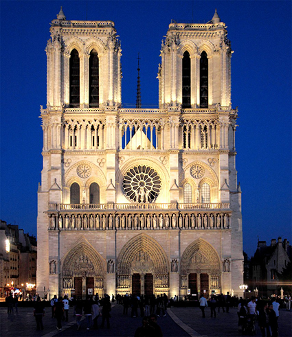 这是一座笼罩着神秘宗教色彩的典型哥特式建筑。石头上精巧令人目眩的镂空减轻其骨架的重量,无比精致的雕花使教堂显得玲珑剔透却又瘦削冷峻。建筑上分布的无数有关宗教故事的雕塑又使它显得神圣庄严。圣母院的平面呈横翼较短的十字型。底部的三个桃形门洞上布满了中世纪时期完成的塑像和雕刻品。中央的拱门上雕刻的是耶稣在天庭的最后审判。拱门上方的众王廊上陈列着旧约时期二十八位君王的雕像。最中间的直径约为十米的巨大玻璃窗就是巴黎圣母院极其著名的玫瑰花窗,上面绘制着神职人员传教用的圣经故事。中央的塑像是圣母圣婴,两旁分别是亚当和夏娃的塑像。