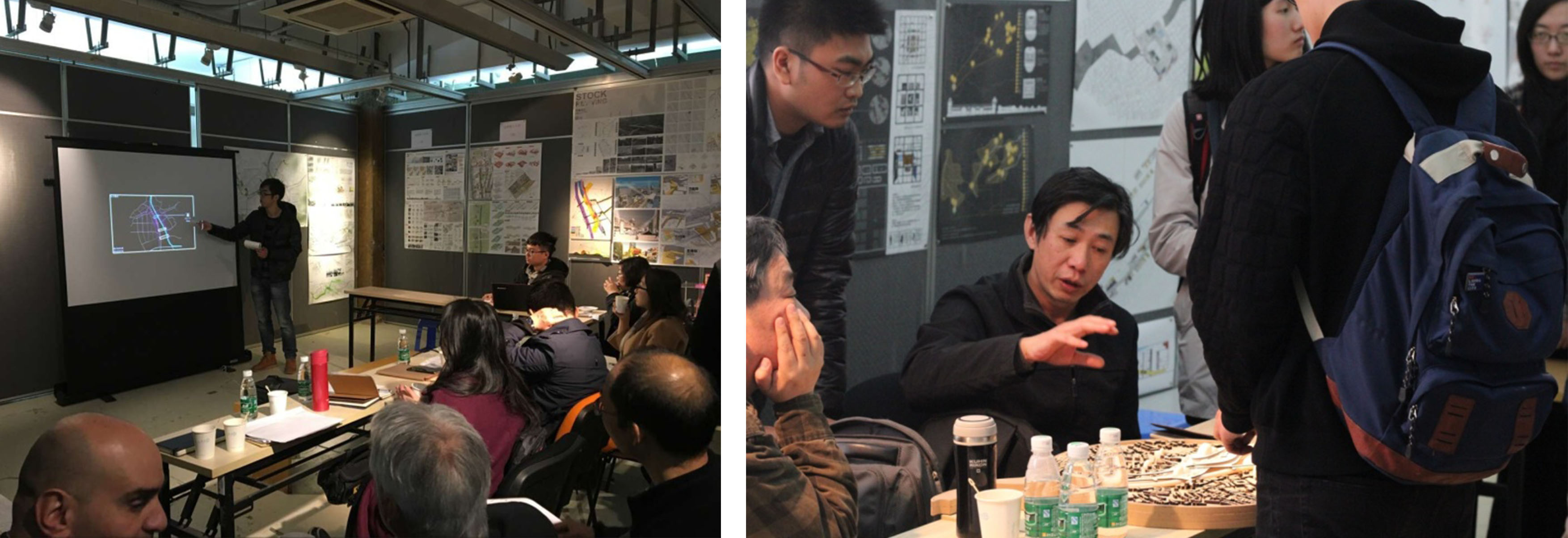 随后,各校师生分成7个答辩组进行混编汇报交流,各组同学以图纸、模型、装置、拼贴、影像及ppt陈述等形式,对设计过程和研究进行充分的展示和阐述,各校指导教师针对每一份作业做了全面、深入并富有争论性的点评。(图3)