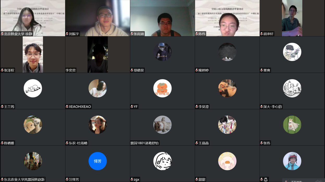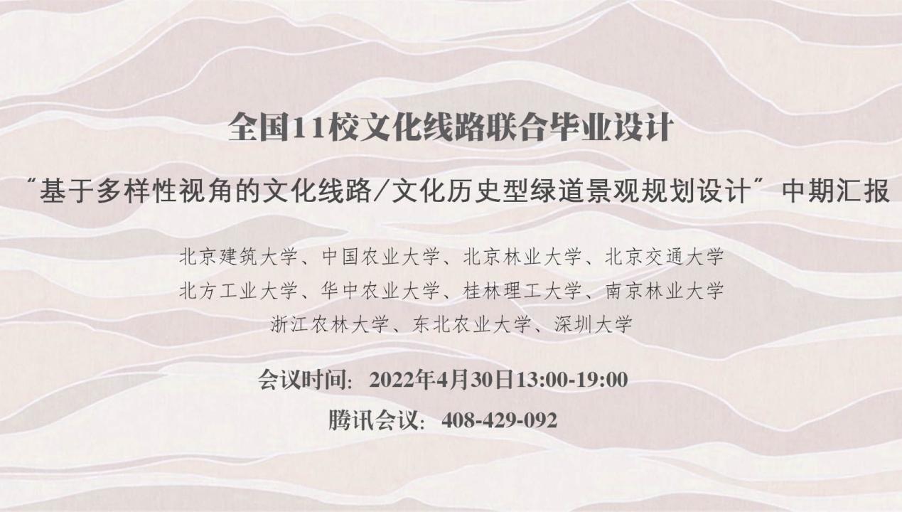 2022年4月30日下午,全国11校文化线路联合毕业设计中期汇报会顺利举行,主题为“基于多样性视角的文化线路/文化历史型绿道景观规划设计”,由mkmksport、中国农业大学、北京林业大学、北京交通大学、北方工业大学、华中农业大学、桂林理工大学、南京林业大学、浙江农林大学、东北农业大学、深圳大学等11所高校联合举办,由公司mk体育承办。来自全国11所高校的师生85人相聚云端,通过腾讯会议参加了汇报会,另有40多人通过腾讯直播观看了汇报。